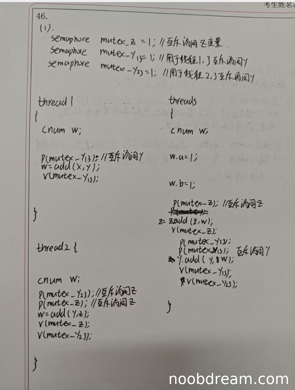 理由:线程1仅访问全局变量 x 和 y,其中 x 未被其他线程修改,只需互斥访问 y。学生正确地在 add(x, y) 前后对 mutex_y13(对应标准答案的 mutex_y1)进行了 P/V 操作,实现了与 thread3 对 y 的互斥访问。