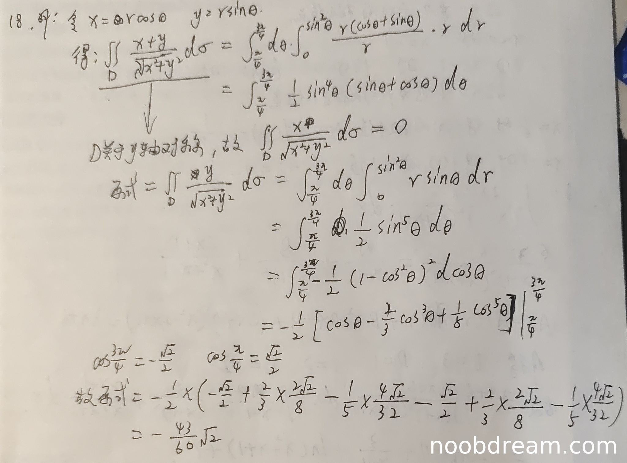 - 对称性应用与表达式混淆:第一次识别结果中,在应用对称性后,出现了表达式 \(\iint_{D}\frac{x^{4}}{\sqrt{x^{2}+y^{2}}}d\sigma = 0\),这显然是识别错误或笔误(应为 \(\iint_{D}\frac{x}{\sqrt{x^{2}+y^{2}}}d\sigma = 0\))。虽然根据上下文可判断其本意是利用被积函数中关于 \(x\) 的奇偶性,但随后的计算中,将原积分拆分为 \(\overline{y^{1}}\) 的计算过程,其被积函数和积分限的书写存在不一致和混乱。