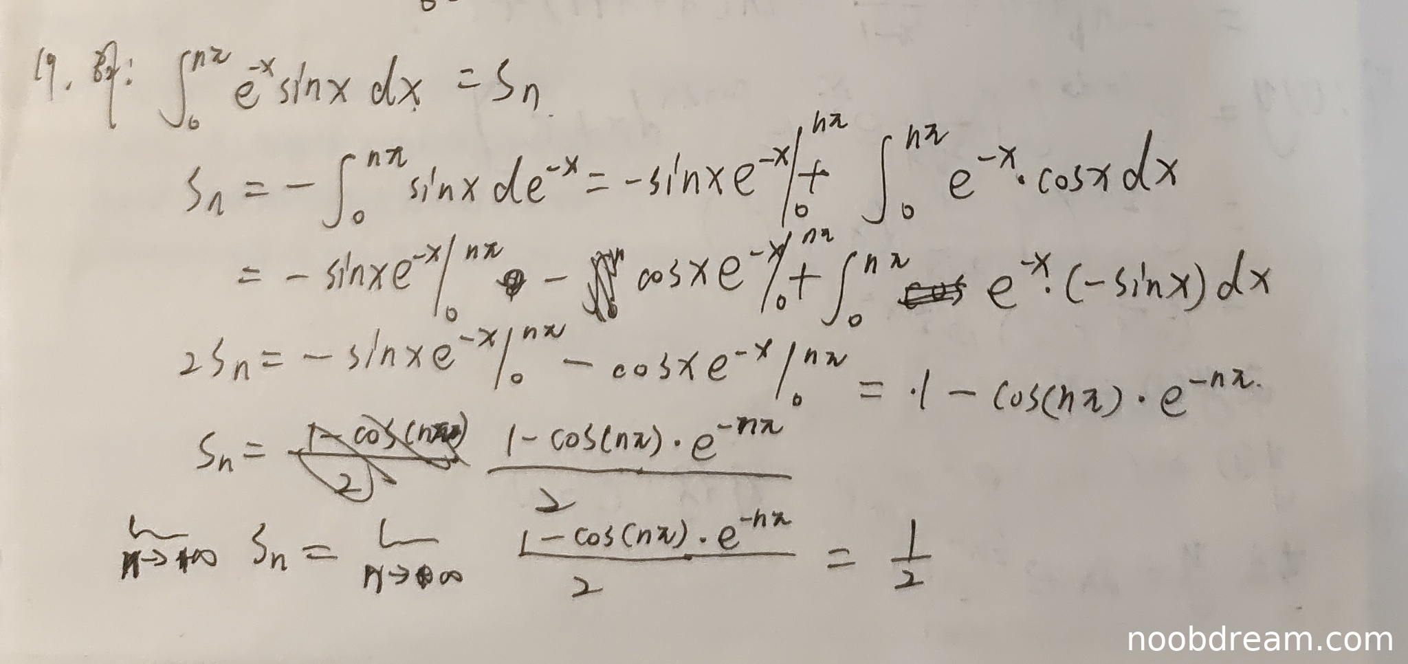 学生作答存在逻辑错误。题目要求的是曲线 \(y = e^{-x} \sin x\) 与 x 轴所围图形的面积,面积应为函数绝对值的积分,即 \(S_n = \int_0^{n\pi} |e^{-x} \sin x| \, dx\)。但学生直接计算了 \(\int_0^{n\pi} e^{-x} \sin x \, dx\),这忽略了 \(\sin x\) 在区间上正负交替的性质,因此得到的是代数和(有正有负的积分),而不是总面积。这是一个根本性的概念错误。