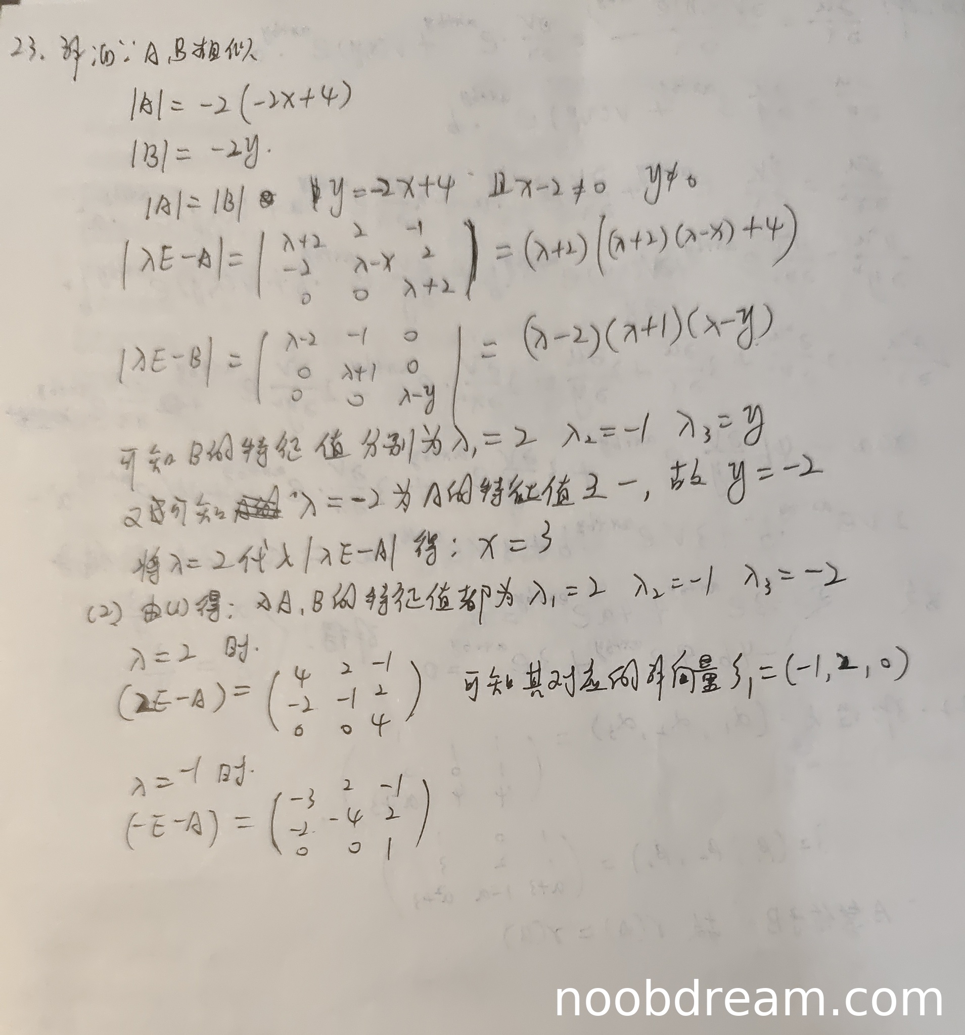 学生首先利用相似矩阵行列式相等得到 |A| = |B|,但计算 |A| 时出现错误:|A| = -2*(-2x - (-2)*2?) 正确计算应为 |A| = (-2)*[x*(-2) - (-2)*2] - (-2)*[2*(-2)-0] + 1*[2*0-0] = (-2)(-2x+4) = 4x-8。而学生写成了 -2(-2x+4) = 4x-8,但后续等式处理时误写为 y = -2x+4(实际上由 |A|=4x-8, |B|=-2y,得 4x-8=-2y ⇒ y = -2x+4,这一步正确)。不过后面从特征多项式入手,发现 λ=-2 是 A 的特征值(因为矩阵 A 是上三角?实际上 A 的第三行是 (0,0,-2),所以 -2 是特征值),由相似矩阵特征值相同,得到 y=-2,再代入 y=-2x+4 得 x=3。虽然中间行列式计算表述有小瑕疵,但最终结果正确,且核心逻辑(用特征值相等求 y,再代入行列式相等求 x)正确。因此扣 1 分(行列式推导表述有误,但不影响最终答案)。得 4 分。