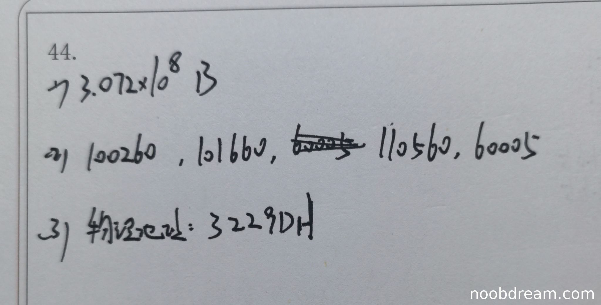 学生的回答“3229DH”与标准答案的物理地址格式完全不符,无法体现计算过程,属于逻辑错误。同时,学生未回答转换过程由什么程序完成。因此,本小题答案错误。
