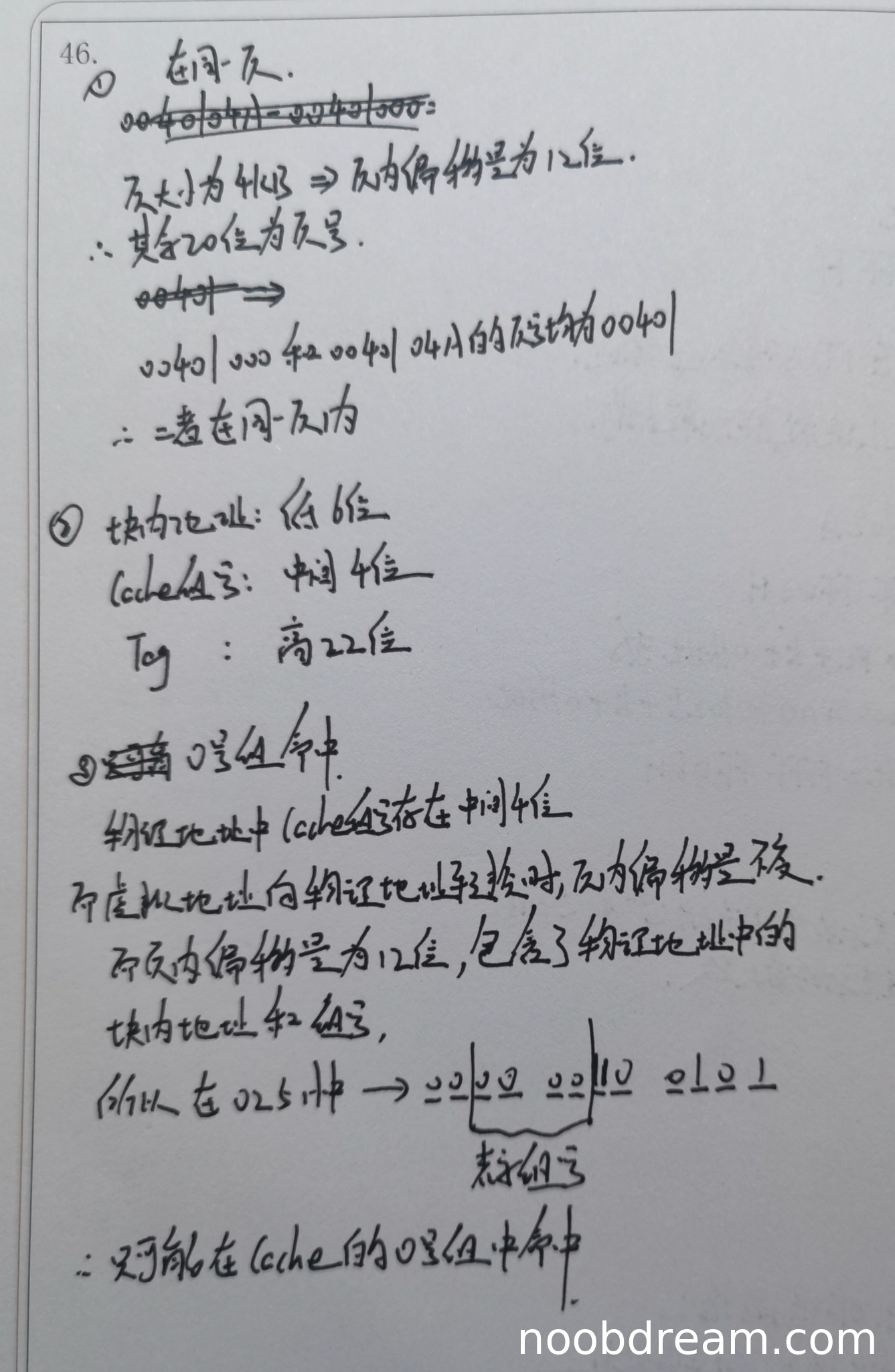 学生回答“只能在cache的0号组中命中”,并给出了分析:虚拟地址转换时页内偏移不变,页内偏移12位包含了物理地址的块内地址和组号,并针对地址025H进行了分析。分析思路与标准答案一致,且结论正确(组号为0)。虽然表述上“跨0号组命中”、“页内偏移量命中”等用语略有模糊,但核心逻辑正确。