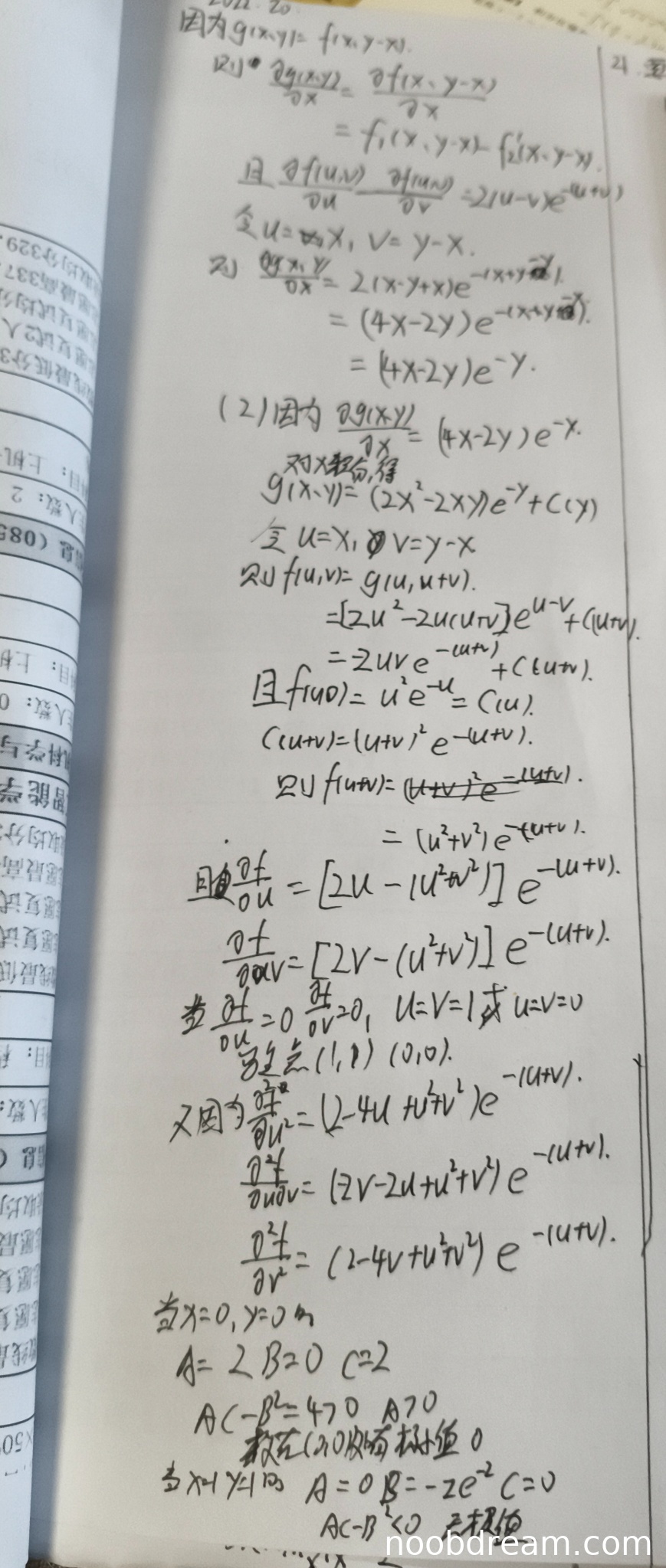 第一次识别结果中,积分时误将 \(\frac{\partial g}{\partial x} = (4x-2y)e^{-y}\) 写为 \((4x-2y)e^{-x}\),导致后续表达式出现错误。但在后续步骤中,通过 \(f(u,v)=g(u,u+v)\) 代入时,指数部分又写为 \(e^{-(u+v)}\),并最终得到正确表达式 \(f(u,v)=(u+v)^2 e^{-(u+v)}\)。第二次识别结果中,积分时同样误写为 \((4x-2y)e^{-x}\),但后续代入时指数部分正确,并最终得到正确表达式。虽然积分步骤有误写,但最终表达式正确,且极值计算过程(驻点求解、二阶偏导计算、判别)均正确。根据“对置信度低的回答,存在识别错误的可能性较高”及“误写导致的逻辑错误不扣分”的原则,本题主要逻辑和最终答案正确,得满分6分。