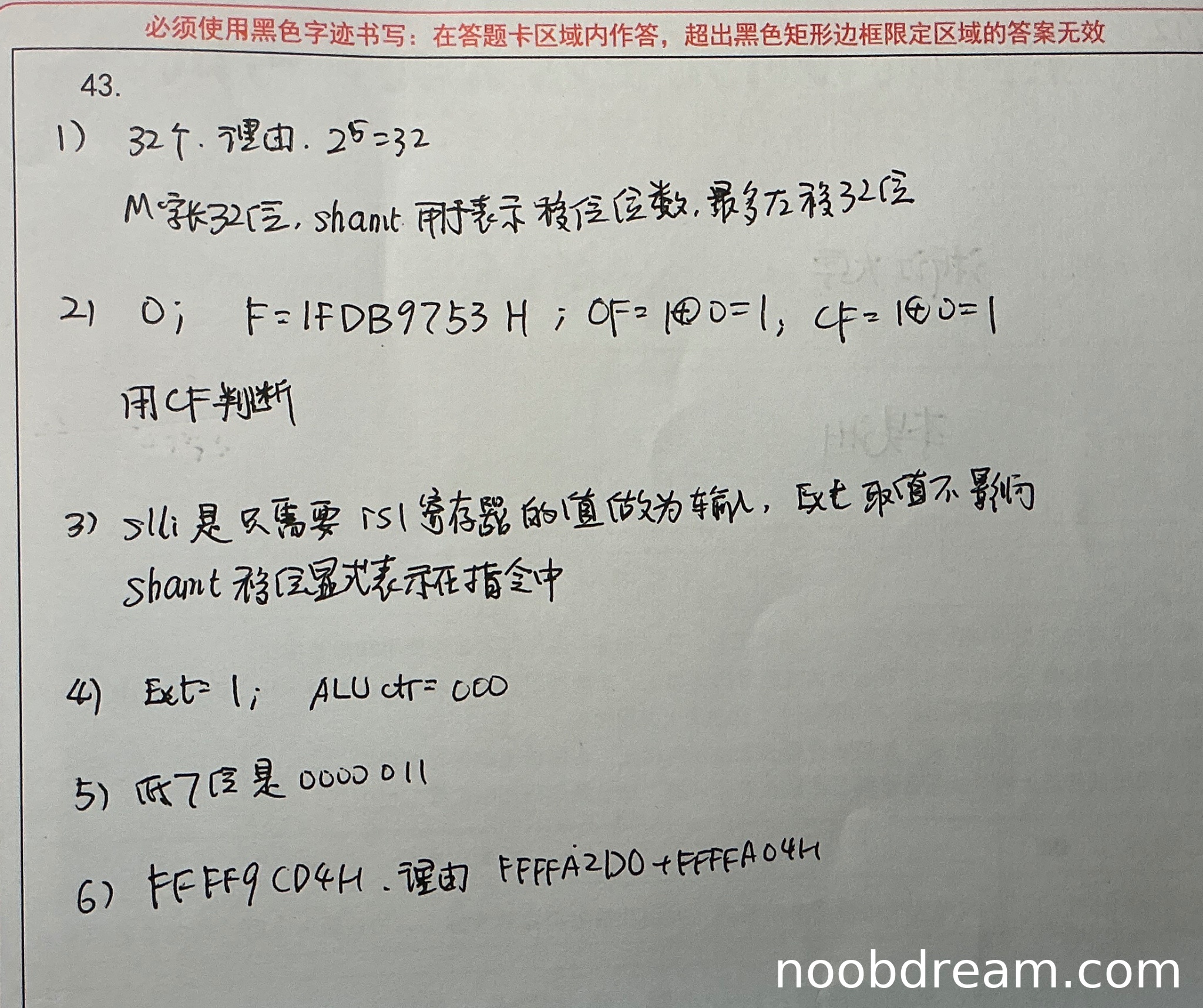 学生回答:“slli是只需要rs1寄存器的值做为输入,Ext取值不影响”和“shamt移位量表示在指令中”这两点表述不准确。标准答案的关键是立即数(imm字段)高12位的最高位为0,因此零扩展和符号扩展效果相同。学生未抓住核心原因,因此扣1分。得1分。