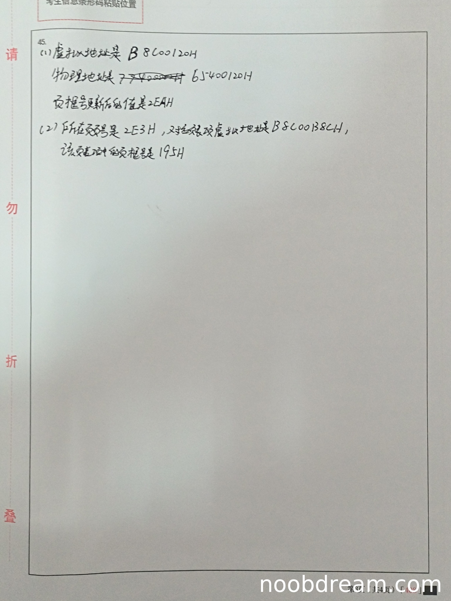 - 该页对应的页表项的虚拟地址:第一次识别结果为B8C0018CH,第二次识别结果为B8C00B8CH。标准答案为B8C00B8CH。第二次识别结果正确,第一次识别结果有误,但根据“只要其中有一次回答正确则不扣分”的原则,此处不扣分。