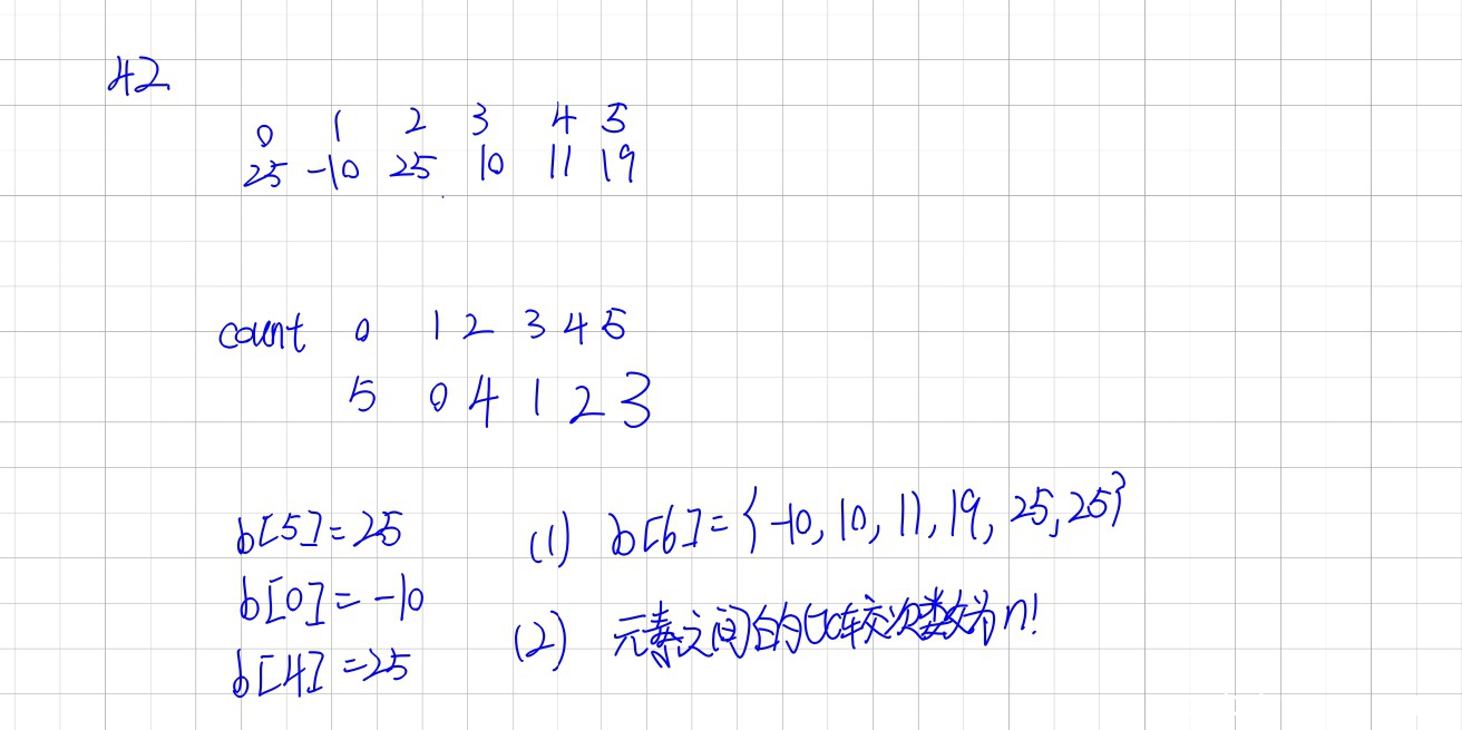学生给出了正确的排序结果:{-10, 10, 11, 19, 25, 25},与标准答案一致。虽然作答过程中有一些中间步骤的展示(如count数组的计算、部分b数组的赋值),但最终答案正确。因此得2分。