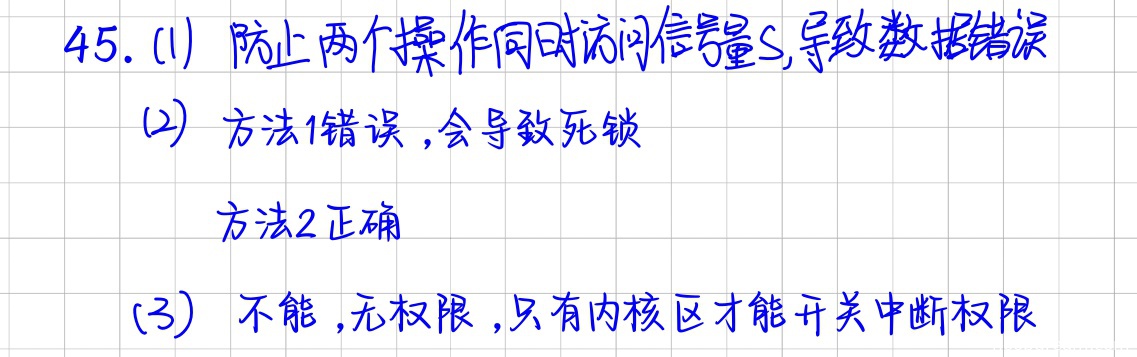 对于方法1,标准答案指出其错误在于“while语句陷入死循环”,学生回答“会导致死锁”。在操作系统语境下,此处“死锁”通常指进程因等待不可能满足的条件而永久阻塞,虽然“死循环”的描述更精确地指出了代码层面的现象,但学生用“死锁”一词也基本表达了“进程无法继续执行”的核心错误,可以接受。