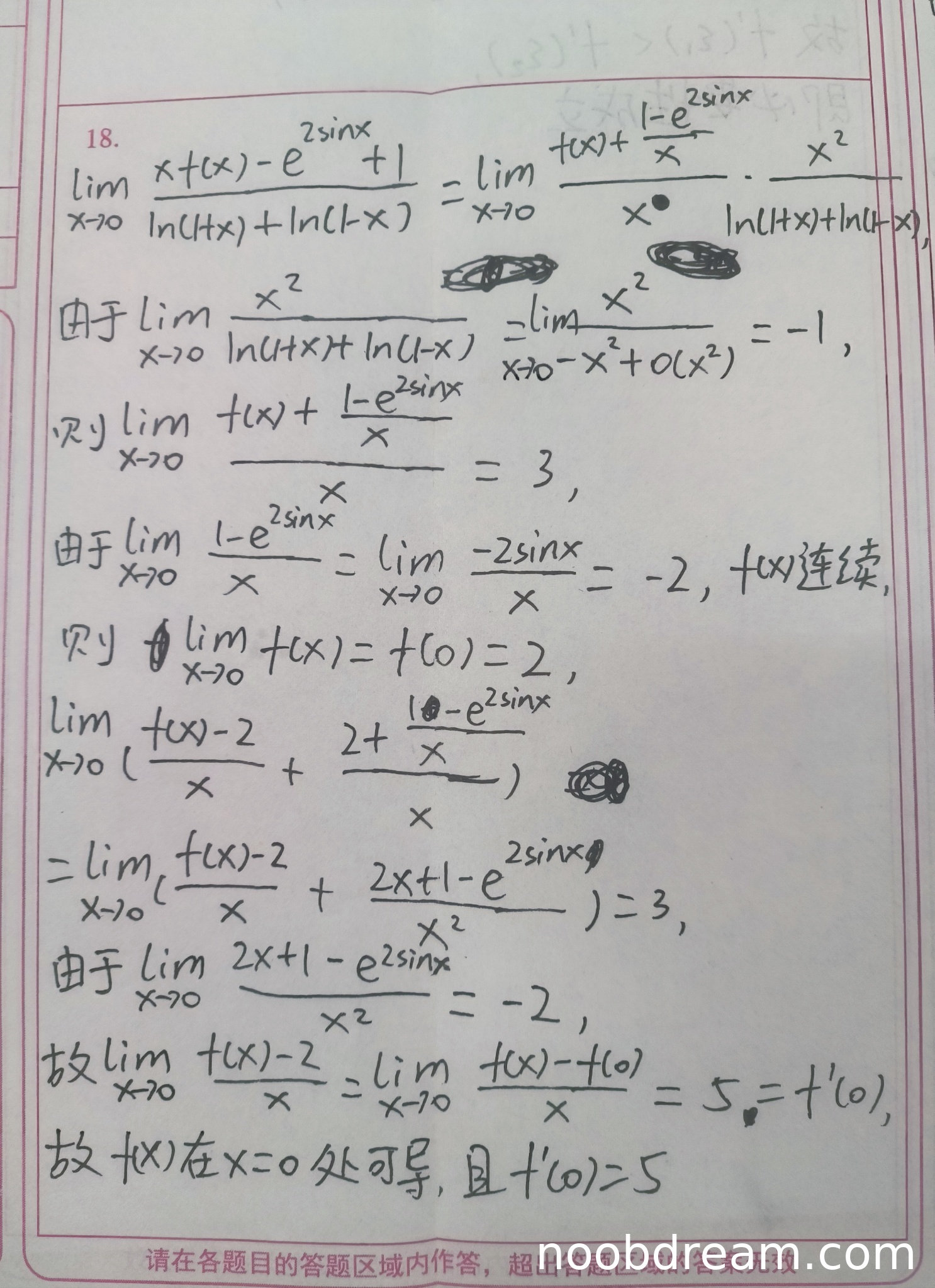 - 进一步通过极限运算得出 \(\lim_{x \to 0} \frac{f(x)-2}{x} = 5\),从而证明可导且f'(0)=5。
