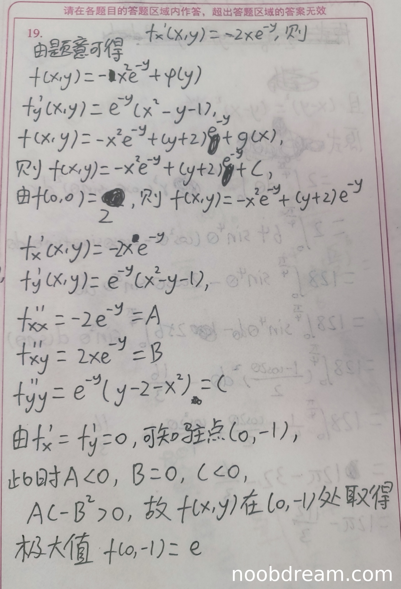 尽管 \( C \) 算错,但学生计算 \( AC-B^2 = (-2e)\times(-3e) - 0 = 6e^2 > 0 \) 且 \( A<0 \),从而得出极大值的结论,并计算极大值 \( f(0,-1) = e \) 正确。这里存在逻辑错误:二阶导数 \( C \) 算错导致判别式 \( AC-B^2 \) 的值错误(正确应为 \( (-2e)\cdot e - 0 = -2e^2 < 0 \),实际上该点不是极值点,标准答案有误?我们需以标准答案为参照)。