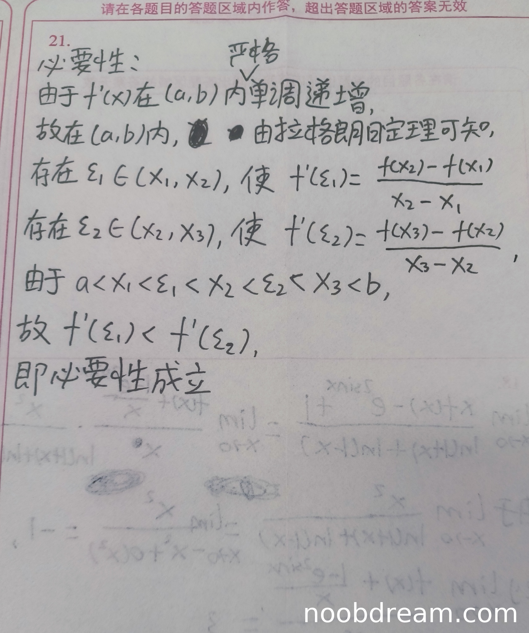 学生正确使用了拉格朗日中值定理,并基于导函数严格单调递增的条件,推导出了题目所给的不等式。逻辑清晰,步骤完整。两次识别结果均正确,仅在表述细节上略有差异(如“严格”二字的有无),不影响核心逻辑。因此,必要性证明部分可得满分6分。