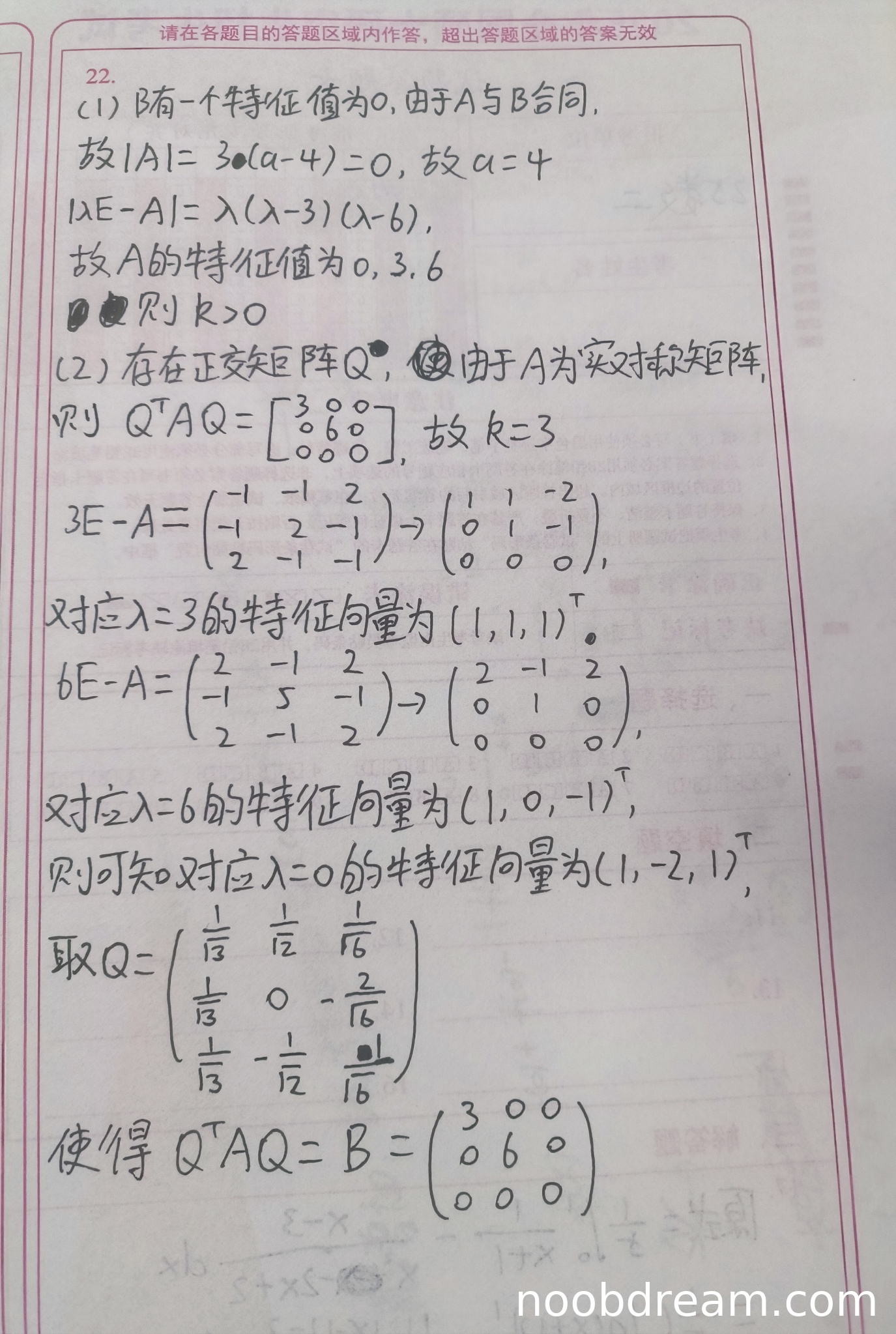 学生正确得出 a=4,并说明 A 的特征值为 0,3,6,从而推出 k>0。但未明确说明 k 的取值范围(应为 k>0 且 k≠6,因为 B 的特征值是 k,6,0,而 A 的特征值是 3,6,0,合同要求正负惯性指数相同,所以 k 必须为正数,且由于 A 的特征值中 6 已经出现,k 只能取 3 才能保证惯性指数一致,但第(1)问只要求 k 的取值范围,标准答案只给出 k>0,学生也给出 k>0,因此此处不扣分。然而学生计算 |A| 时写为 3(a-4)=0,实际上 |A| = -3(a-4),但最终得到 a=4 正确,可能是笔误或识别问题,不扣分。整体思路正确,结果正确,但表述上对惯性指数的推理不够清晰。扣1分。