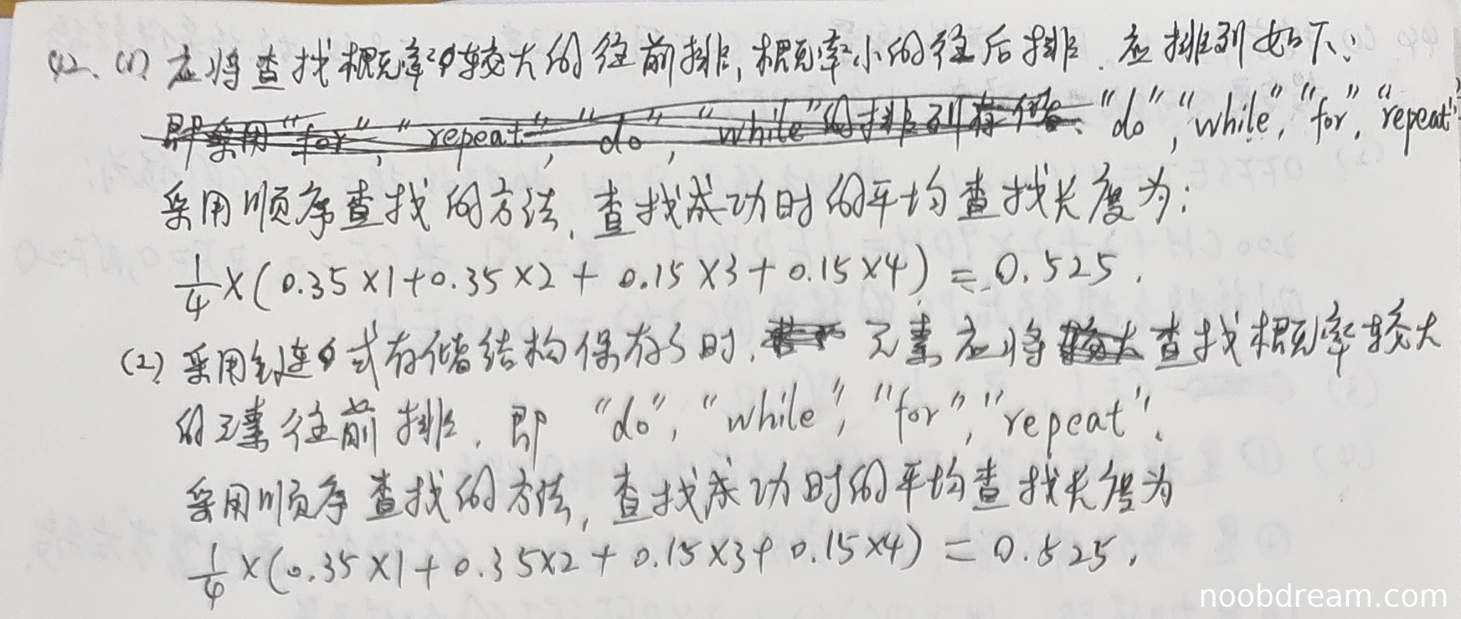 学生答案中,对于链式存储结构,同样提出将查找概率较大的元素往前排(降序排列),并采用顺序查找方法,这部分思路正确。但同样在计算平均查找长度时错误地乘以了1/4,导致计算结果为0.525,正确计算应为2.1。这是一个逻辑错误(计算错误),扣2分。因此,本小题得分为:排列和查找方法正确得3分,计算错误扣2分,最终得1分。