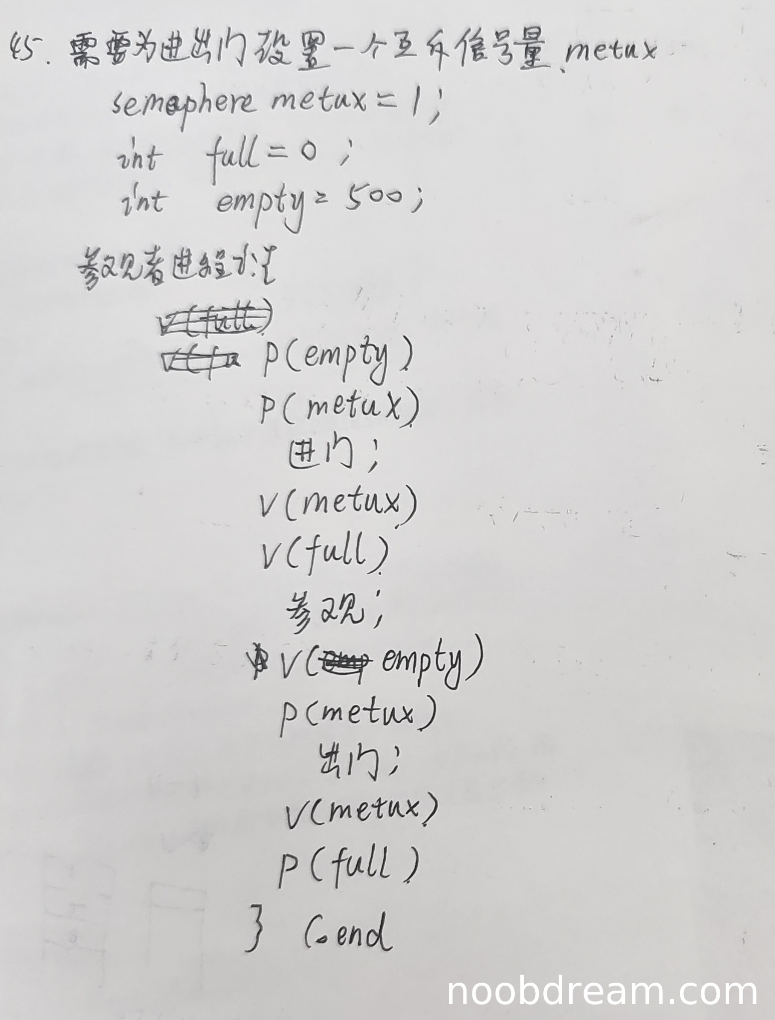 理由:学生对容量控制的逻辑存在严重错误。在第一次识别结果中,使用了 if (full) 条件判断,这不是信号量的标准用法,且后续的 P(empty) 和 V(empty) 位置混乱(例如在参观后执行 V(empty),在出门后又执行 P(full))。在第二次识别结果中,顺序为 P(full) P(empty) P(metux),但 full 初值为0,导致 P(full) 会直接阻塞,逻辑错误。整体上,未能正确使用信号量 empty 来控制博物馆内人数(应在进门前 P(empty) 减少空位,出门后 V(empty) 增加空位),因此不得分。