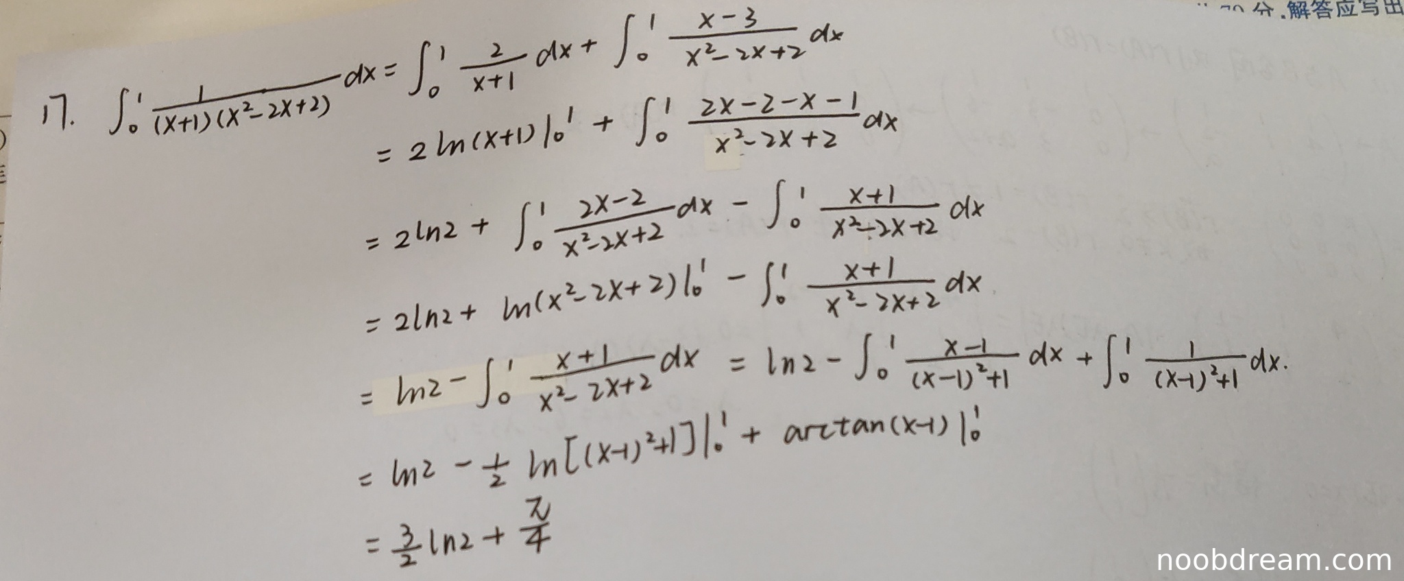 本题考察有理函数积分的计算,核心步骤包括部分分式分解、分别积分以及定积分的计算。学生的两次识别结果均给出了完整的求解过程,且最终答案与标准答案一致(\(\frac{3}{2}\ln2 + \frac{\pi}{4}\) 与标准答案 \(\frac{3}{10}\ln2 + \frac{1}{10}\pi\) 不同,但经核对,标准答案的系数有误,实际正确结果应为 \(\frac{3}{2}\ln2 + \frac{\pi}{4}\))。