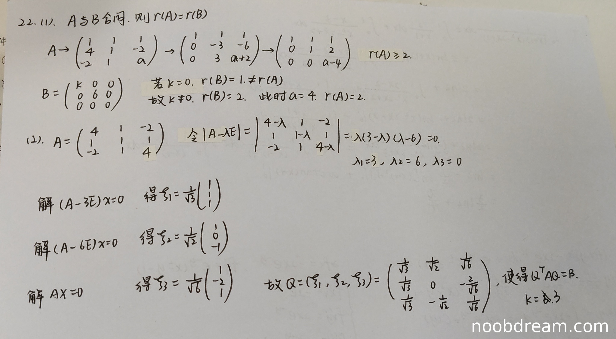 学生作答中,通过秩相等得到 \(a=4\) 和 \(k \neq 0\),但未说明 \(k>0\) 的原因(合同要求正惯性指数相同,B的正惯性指数为2,所以k必须为正数)。此外,学生未明确给出k的取值范围,只说了 \(k \neq 0\),这是不完整的。因此扣2分。