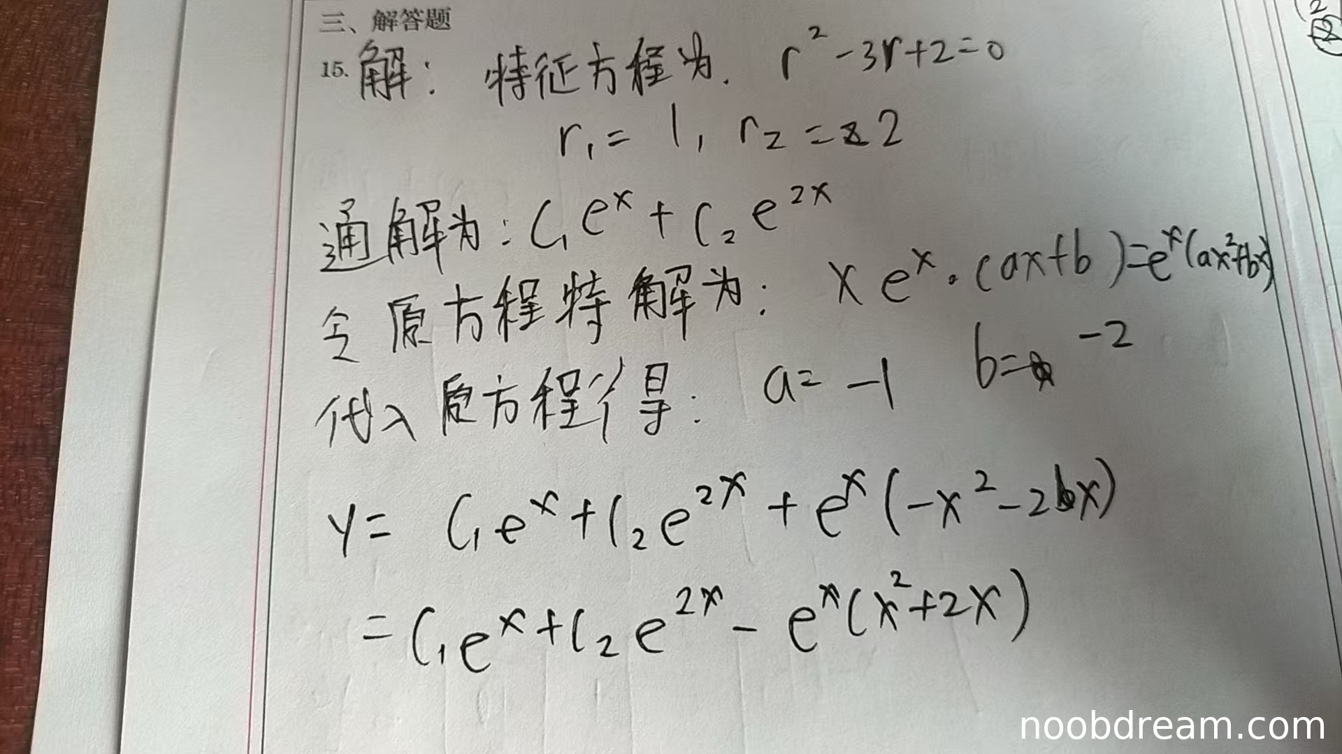 - 求特解系数:将特解代入原方程,学生得出 \(a=-1, b=-2\),与标准答案一致。