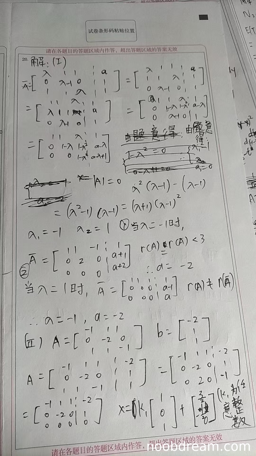学生作答中,第一次识别结果和第二次识别结果均包含了求解 λ 和 a 的过程。虽然两次识别在矩阵变换的书写上存在大量混乱、错误甚至无法理解的步骤(例如第一次识别中出现了 a²、bλ-λ²、1-λ⁴ 等明显错误的表达式),但核心思路与标准答案一致:先由方程组有两个不同解推出 |A|=0,从而得到 λ=1 或 λ=-1;再分别代入判断有解条件以确定 λ 和 a。