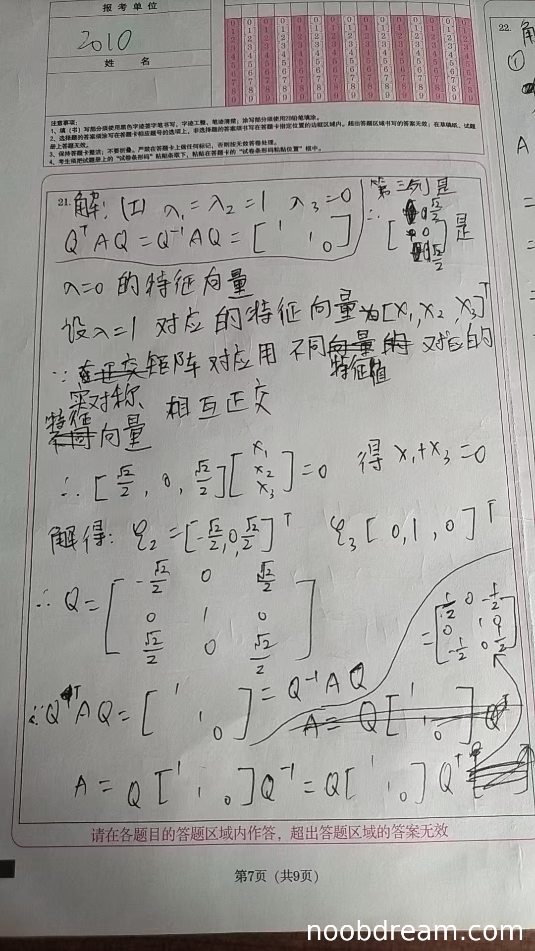 学生作答中给出了正确的特征值(1,1,0),并正确写出正交对角化关系 \(Q^TAQ = \Lambda\),进而得到 \(A = Q\Lambda Q^T\)。利用已知的 \(Q\) 第三列,通过正交条件求出前两列(特征向量),并进行了单位化,最终计算出矩阵 \(A\)。思路完整,计算正确。但答案中 \(\xi_2\) 的写法与标准答案顺序略有不同(标准答案中 \(\beta_1\) 对应第一列,学生写的 \(\xi_2\) 对应第一列),且学生未明确写出最终 \(A\) 的数值矩阵,但根据上下文和(II)中给出的 \(A+E\) 可反推 \(A\) 正确。由于核心逻辑与计算无误,给满分。