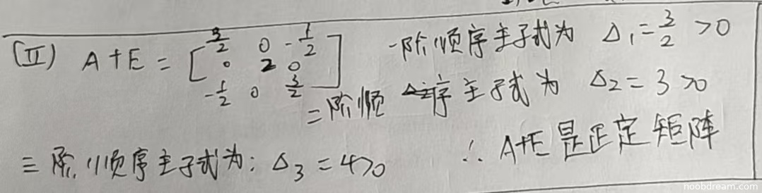 学生直接计算 \(A+E\) 并验证其各阶顺序主子式均大于0,从而证明正定性。方法正确,计算无误。虽然未像标准答案那样先说明实对称性再通过特征值判断,但题目中 \(A\) 实对称故 \(A+E\) 也实对称,用顺序主子式判定正定也是完全正确的等价方法,因此不扣分。