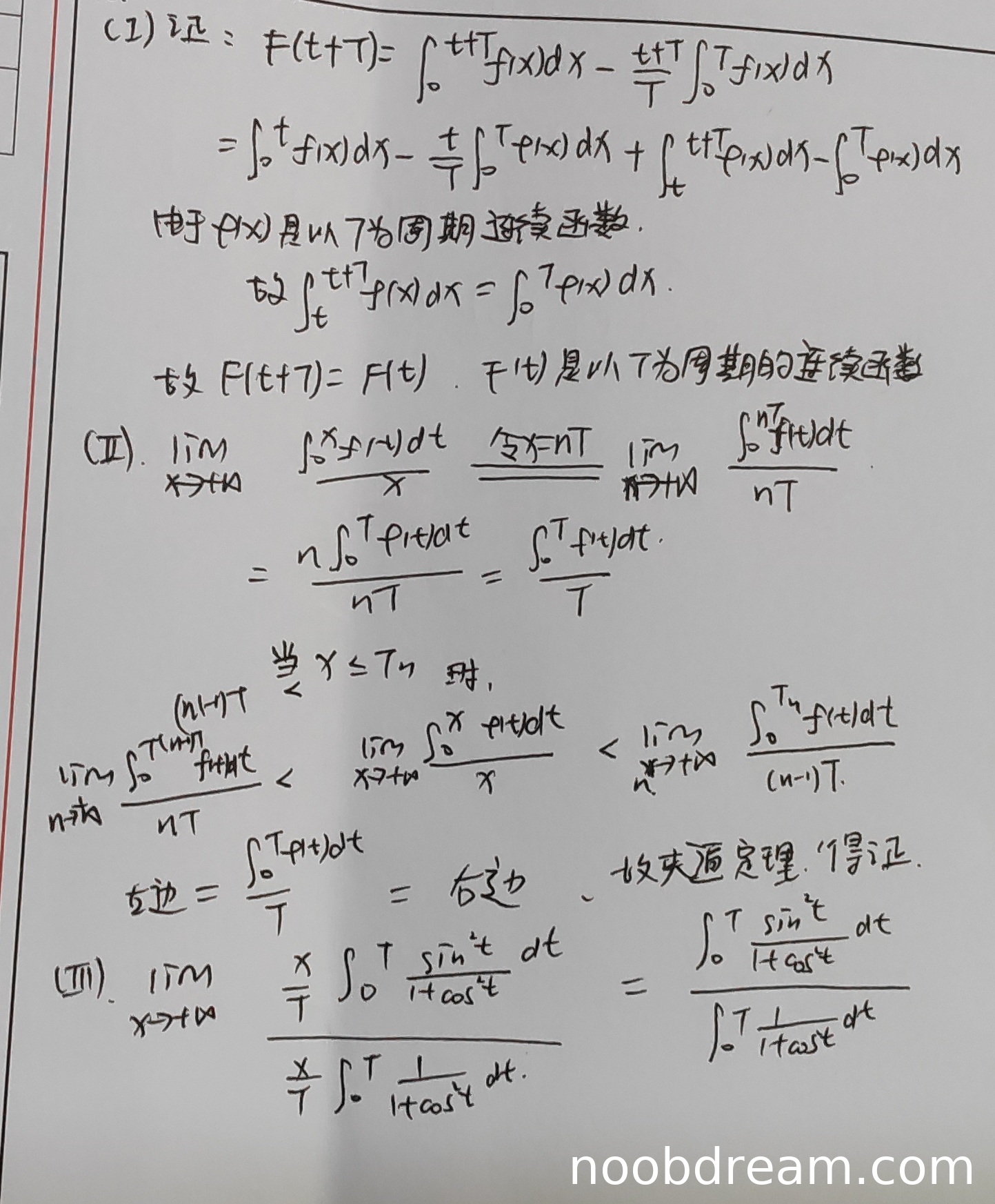 学生的思路是令 \(x=nT\) 并利用周期函数的积分性质,但证明不完整。在标准答案中,利用(Ⅰ)中构造的有界周期函数 \(F(t)\) 得到 \(\lim_{x\to+\infty}\frac{F(x)}{x}=0\),从而直接推出结论。学生试图用夹逼定理,但夹逼不等式的书写有误(例如“当 \(x \leq nT\) 时”应为考虑 \(nT \leq x < (n+1)T\) 的情形),且夹逼的左右极限计算不严谨。此外,学生未说明 \(f\) 连续且周期,因此积分可加性成立,但证明框架基本正确,主要思路正确但细节有瑕疵。扣 1 分。得 3 分。