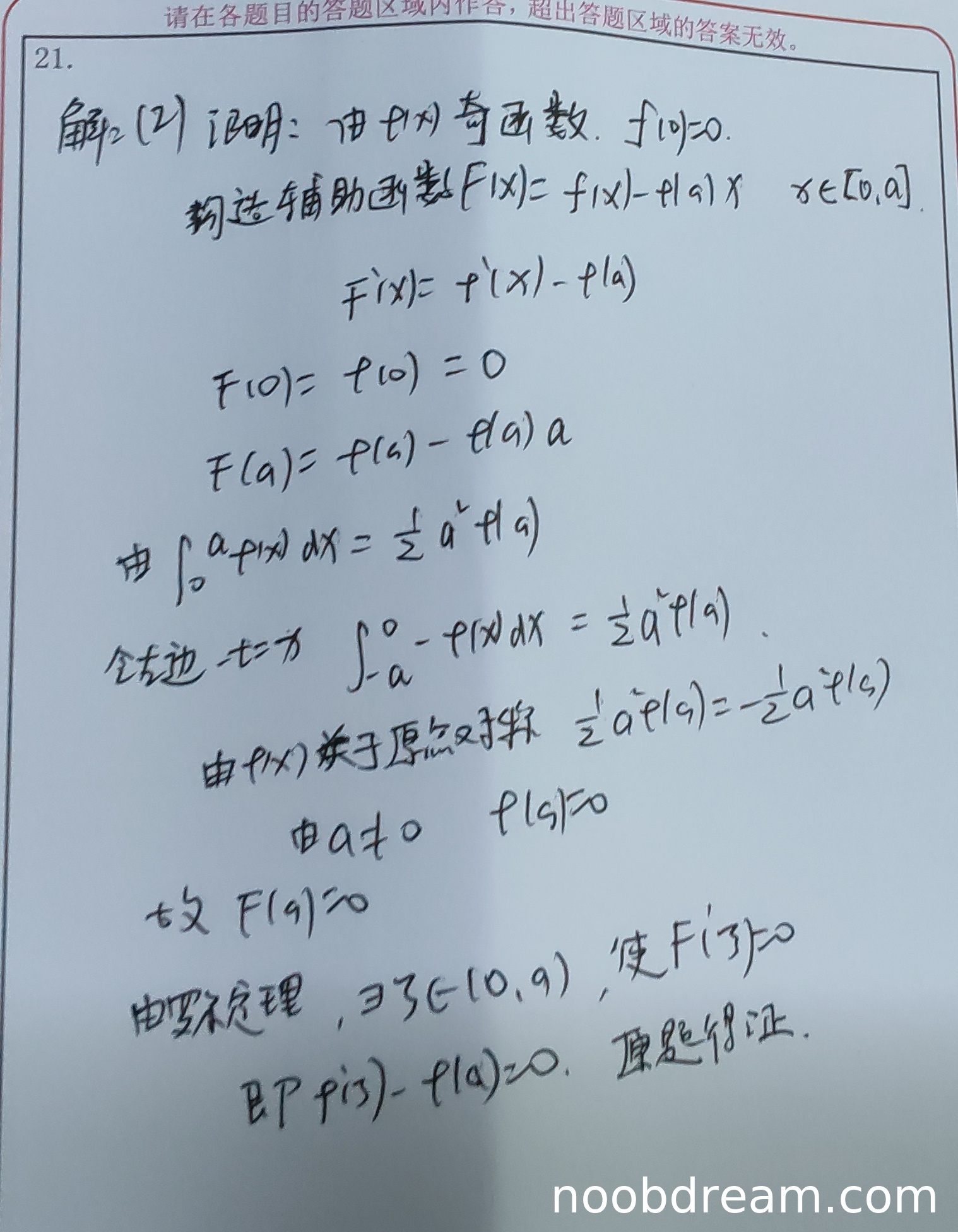 学生只证明了第(Ⅰ)问,但证明过程存在逻辑错误。学生试图利用奇函数性质和积分条件推导出 \( f(a)=0 \),进而得到 \( F(a)=0 \),然后应用罗尔定理。然而,从 \(\int_{-a}^{0} f(x) dx = \frac{1}{2}a^2 f(a)\) 和奇函数性质(\(\int_{-a}^{0} f(x) dx = -\int_{0}^{a} f(x) dx\))确实可以推出 \(\frac{1}{2}a^2 f(a) = -\frac{1}{2}a^2 f(a)\),从而 \(f(a)=0\)。但题目给出的条件是 \(\int_{0}^{a} f(x) dx = \frac{1}{2}a^2 f(a)\),学生将其错误地用于推导 \(\int_{-a}^{0} f(x) dx\),逻辑上不严谨且绕过了题目设定的辅助函数构造和积分中值定理的应用思路。虽然最终得到了 \(f(a)=0\) 和 \(F(a)=0\),并应用罗尔定理得出 \(f'(\xi)=f(a)=0\),这与结论 \(f'(\xi)=f(a)\) 在 \(f(a)=0\) 时形式上一致,但证明方法偏离了标准答案的核心思想(利用积分中值定理和 \(F(x)\) 的零点分布),且关键步骤(从给定积分条件推导 \(f(a)=0\))的推理链条存在跳跃和错误应用(错误地将条件用于对称区间)。因此,不能给满分。考虑到学生正确构造了 \(F(x)\),并试图应用罗尔定理,但主要逻辑推理有缺陷,扣3分。