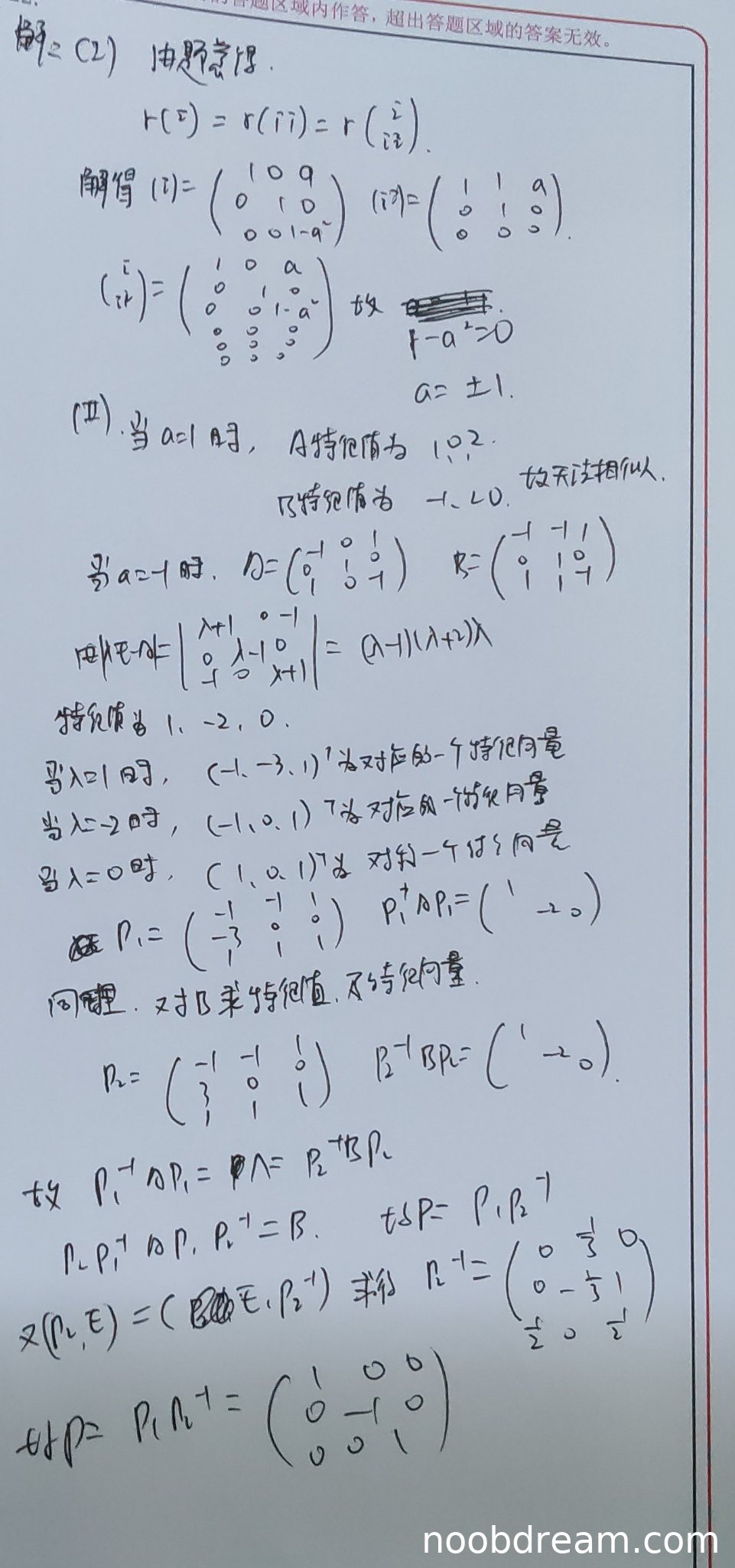 3. 逻辑错误3(矩阵P的求解):学生构造的P1和P2由错误的特征向量组成,且P2的构造直接使用了题目给出的B矩阵(但写错了元素)而非其特征向量,这是概念错误。后续计算P2^{-1}和P的过程也因此错误,最终得到的P=\begin{pmatrix}1&0&0\\0&-1&0\\0&0&1\end{pmatrix}是一个对角阵,这显然不能使A和B相似(除非A=B)。