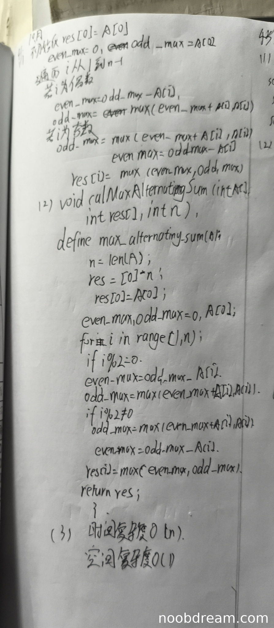 - 初始化问题:`even_max` 初始化为0,而标准答案中对于 i=0 的位置,偶数长度状态是不存在的,应初始化为一个极小值(如 `INT_MIN`)。虽然在某些情况下初始化为0可能碰巧得到正确结果,但这不是通用、严谨的做法。考虑到主要扣分点在于上述逻辑错误,此处不额外扣分。
