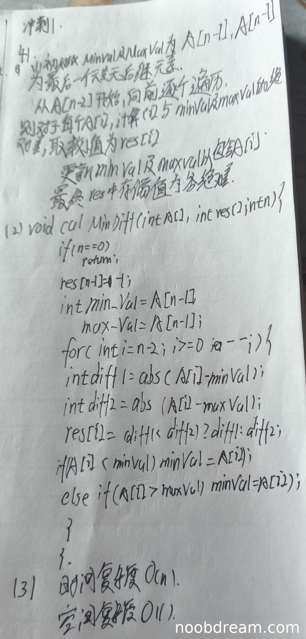 理由:学生的算法设计思想存在根本性错误。其核心思路是仅维护已遍历元素的最小值(min_Val)和最大值(max_Val),并认为对于当前元素A[i],它与后续所有元素的最小绝对差,必然是与这个最小值或最大值的绝对差之一。这是不正确的。例如,数组A = [5, 8, 4, 7],从右向左处理,当i=0时,A[0]=5,已遍历元素为[8,4,7],其min_Val=4,max_Val=8。按照学生算法,res[0] = min(|5-4|, |5-8|) = 1。但实际上,A[0]与后续元素的最小绝对差是与A[3]=7的差,即|5-7|=2,而1是与A[2]=4的差,但A[2]的索引2 > 0,它确实是后续元素,所以这里学生算法碰巧得到了正确结果。然而,考虑另一个例子A = [10, 2, 1, 12],从右向左,当i=0时,A[0]=10,已遍历元素为[2,1,12],min_Val=1,max_Val=12。学生算法给出res[0] = min(|10-1|, |10-12|) = 2。但实际最小绝对差是|10-12|=2,这里又碰巧对了。但关键反例:A = [5, 3, 8, 6]。从右向左,处理A[0]=5时,后续元素[3,8,6],min_Val=3,max_Val=8。学生算法给出res[0] = min(|5-3|, |5-8|) = 2。但实际最小绝对差是|5-6|=1。因此,该设计思想不能保证结果的正确性,属于逻辑错误。故本部分不得分。