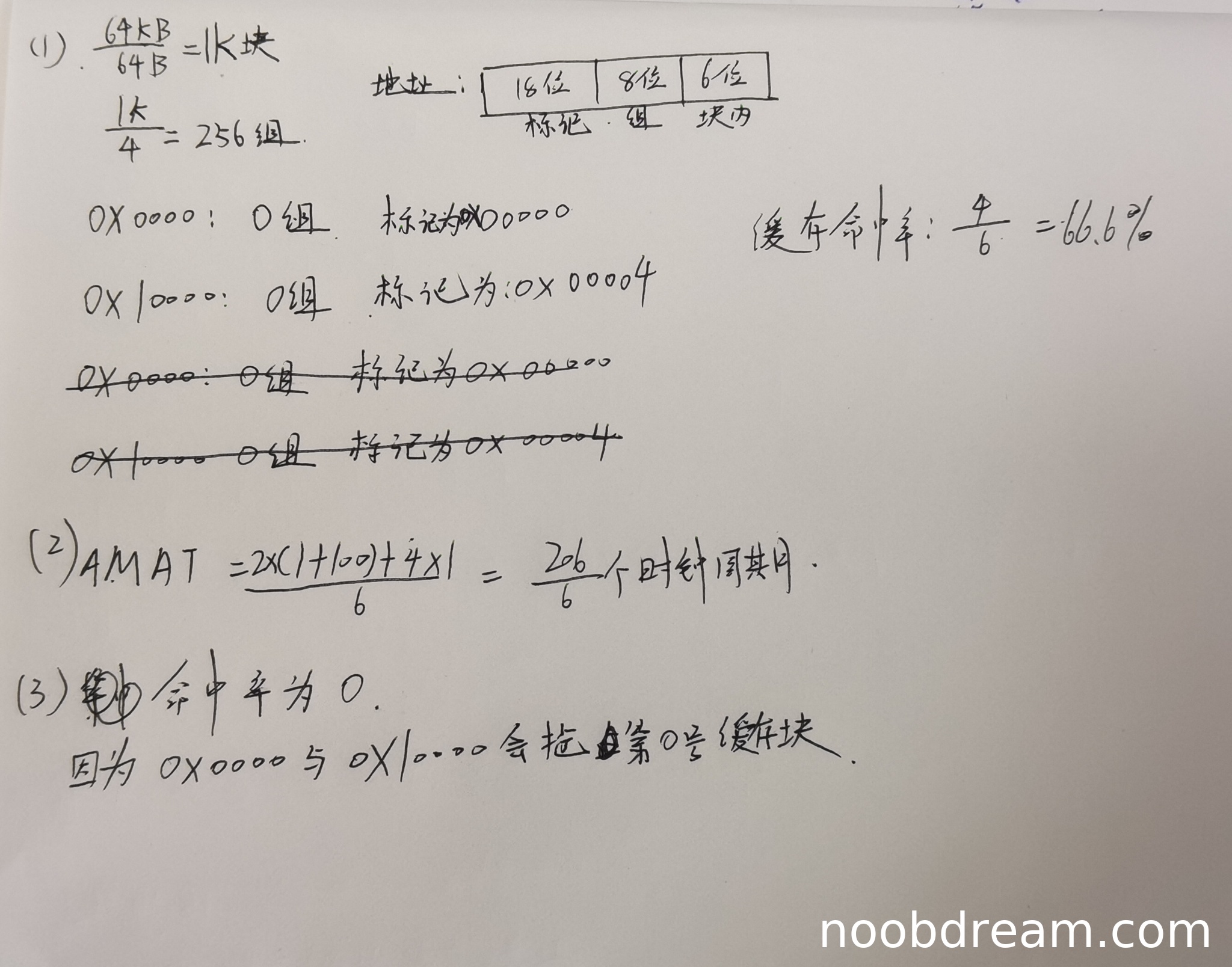 学生答案:命中率计算为4/6=66.6%,与标准答案一致。计算过程中,学生正确得出块数、组数,并指出地址映射到同一组(0组)。虽然标记位的具体数值写法不规范(如“0×00004”应为块地址或标记值,但意思可理解为块1024),且地址划分的位数描述(16位标记、8位索引、6位偏移)在32位地址下不完全准确(实际应为18位标记、8位索引、6位偏移),但核心逻辑(两组地址映射到同一组,且4路组相联下经过前两次缺失后能命中)正确。根据“思路正确不扣分”原则,且识别结果中关键数字和结论无误,不扣分。