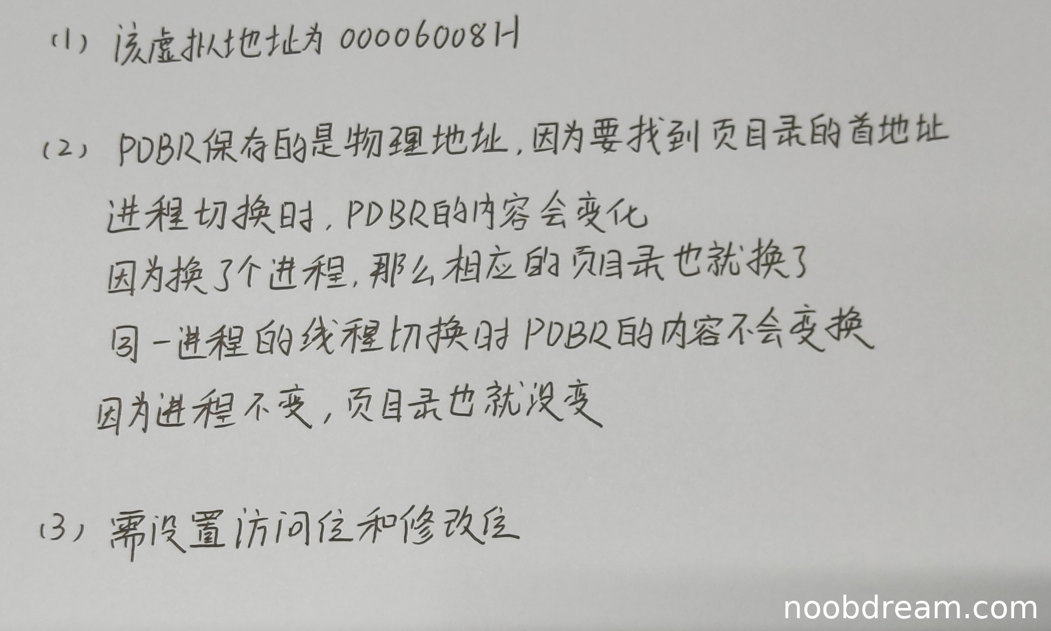 学生答案正确指出PDBR保存的是物理地址,并给出了正确理由(要找到页目录的首地址)。