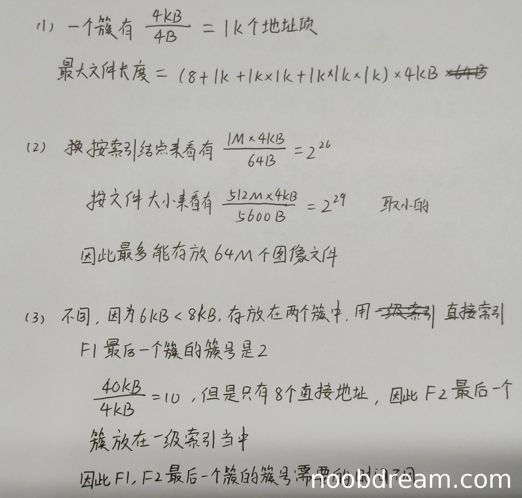 学生答案正确计算了索引节点总数:\( \frac{1\text{M} \times 4\text{KB}}{64\text{B}} = 2^{26} = 64\text{M} \)。同时,也计算了按数据簇能存放的文件数:\( \frac{512\text{M} \times 4\text{KB}}{5600\text{B}} \approx 2^{29} \),并正确指出取两者较小值 \( 64\text{M} \)。虽然计算过程中“2^{29}”是近似值(实际应为 \( 512M \times 4KB / 5600B \approx 374,491,428 \),略小于 \( 2^{29} \)),但核心逻辑(比较索引节点数和数据簇能支持的文件数,取最小值)完全正确,且最终答案正确。因此得2分。