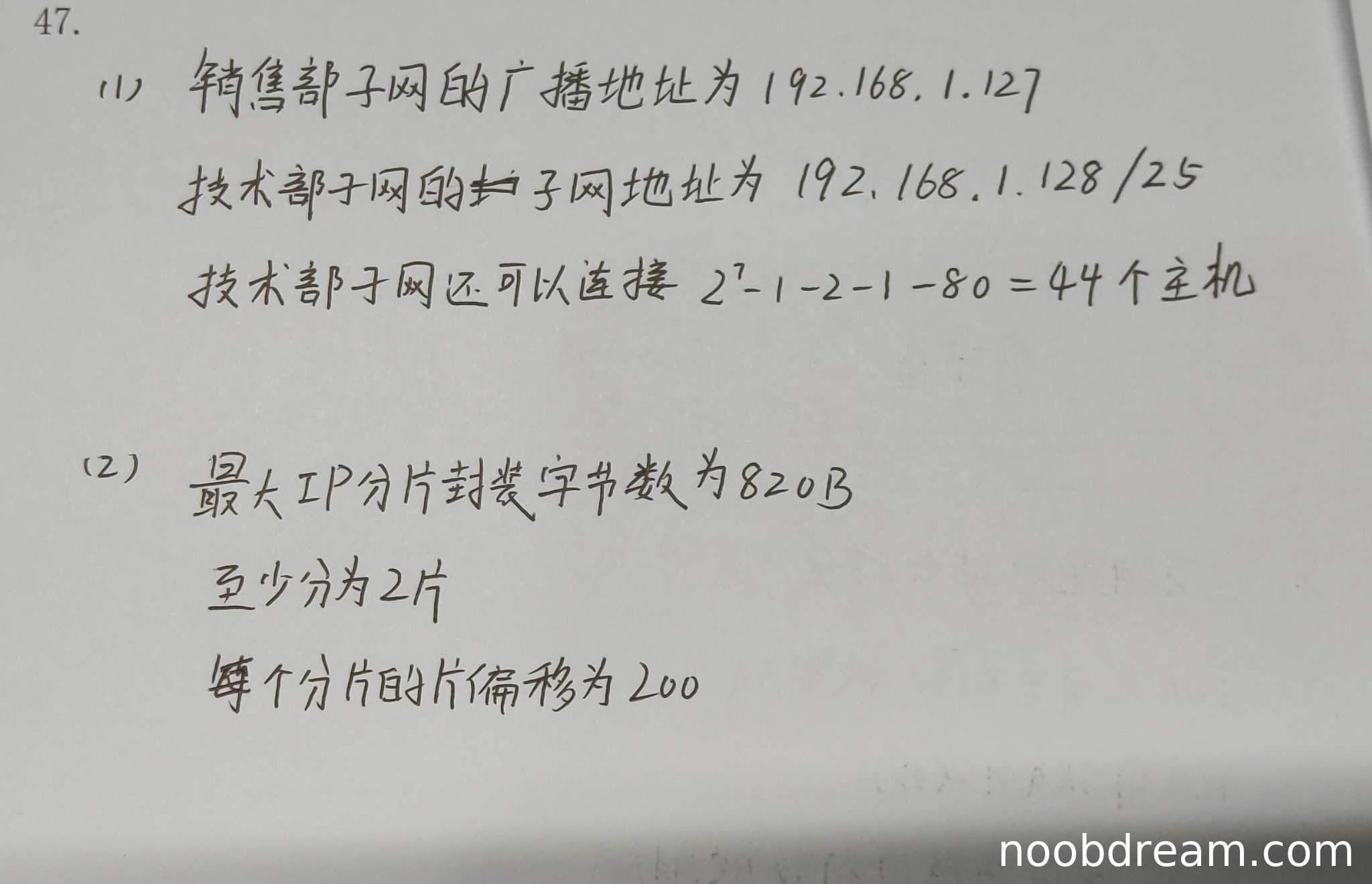 第一问:销售部子网的广播地址为192.168.1.127,与标准答案一致,得1分。