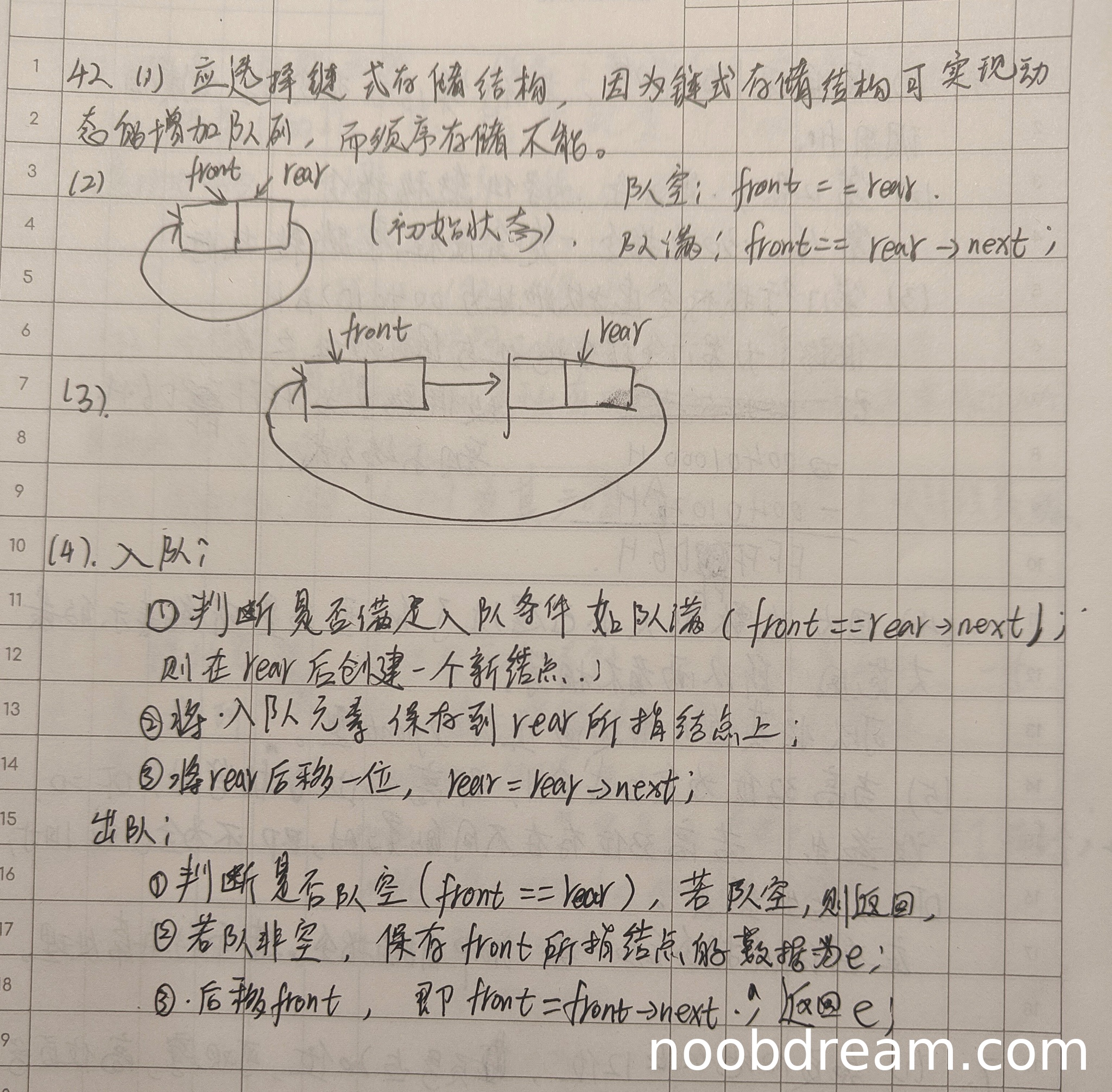 学生正确给出了队空条件(front == rear)和队满条件(front == rear->next),这与标准答案一致。对于初始状态,学生文字描述为“front,rear”并给出了队空条件,虽然没有像标准答案那样明确画出“均指向一个空结点”的图,但根据其描述和条件可以推断出初始状态是front和rear指向同一节点(即空队列)。考虑到识别可能存在的误差以及核心逻辑(判断条件)完全正确,不扣分。得4分。