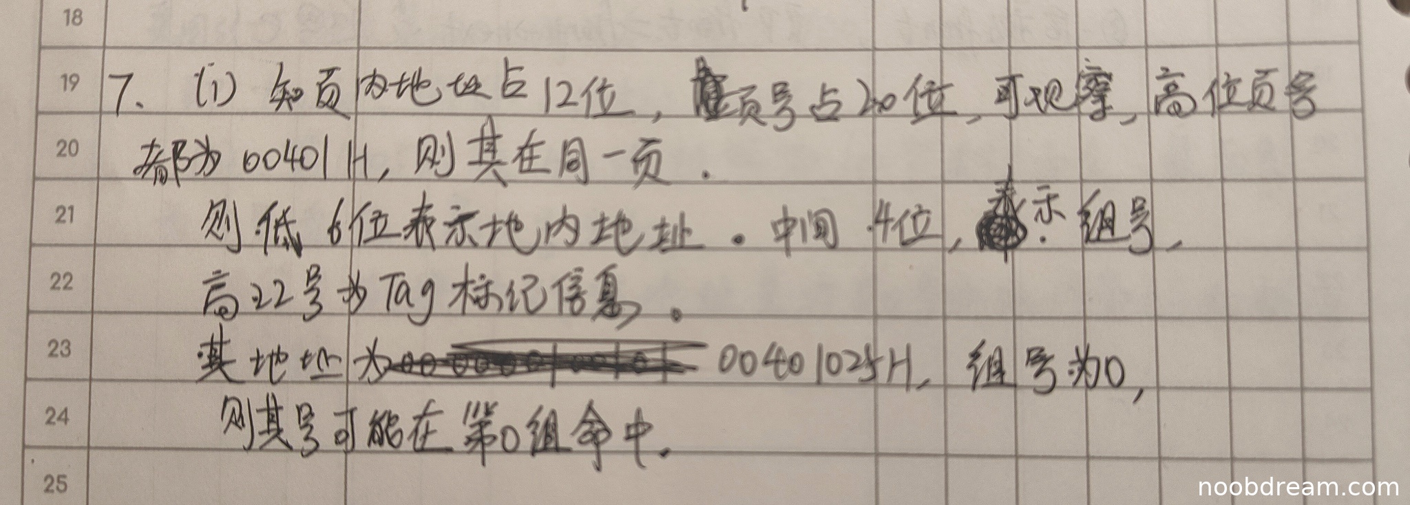 学生正确给出call指令地址为00401025H,并得出组号为0,因此只可能在指令Cache第0组命中。其分析过程(将地址分解,得出组号)与标准答案逻辑一致,结论正确。得2分。