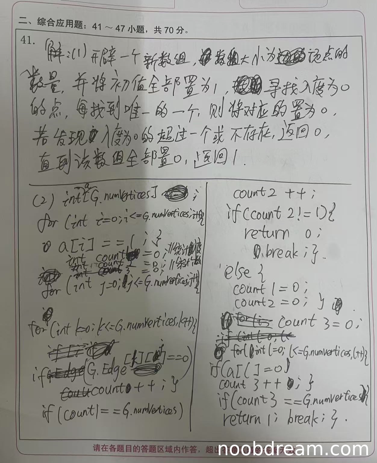 理由:学生给出了基本的设计思想,即通过维护一个数组记录顶点状态,寻找入度为0的顶点,并判断是否唯一。思路与拓扑排序判断唯一性的核心思想一致,但描述较为简略,没有明确说明需要计算每个顶点的入度、以及如何动态更新入度,也没有提到需要用队列或循环来迭代处理顶点。因此扣2分。