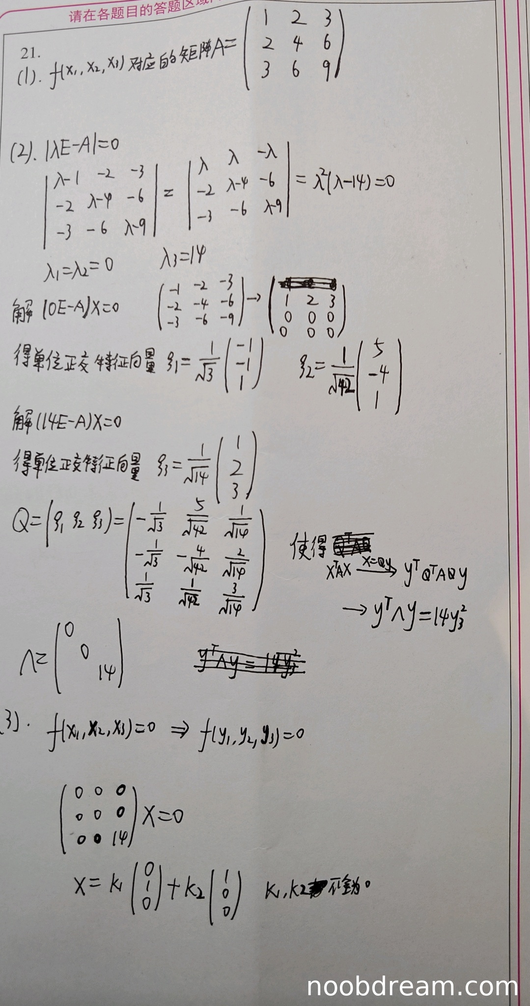 学生正确求出了特征值 \( \lambda_1 = \lambda_2 = 0, \lambda_3 = 14 \),并求出了对应的特征向量。虽然学生给出的属于特征值0的两个特征向量 \( \xi_1, \xi_2 \) 与标准答案不同,但它们是线性无关的,并且经过正交化后可以构成正交矩阵,思路正确。学生构造了正交矩阵 \( Q \),并指出正交变换后的标准形为 \( 14y_3^2 \),这与标准答案 \( 14y_1^2 \) 本质相同(只是变量下标顺序不同)。因此整体思路和结果正确,得4分。