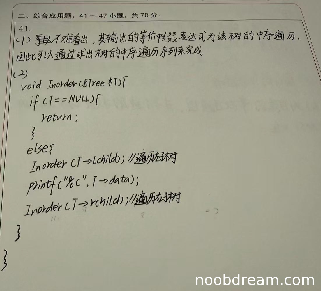 理由:学生提供的算法代码仅仅是标准的二叉树中序遍历,它只能输出中序序列(如“a+b*c-d”),而无法输出题目要求的、带有必要括号以反映计算次序的中缀表达式(如“(a+b)*(c*(-d))”)。该代码完全没有实现添加括号的逻辑,因此算法功能与题目要求不符,属于严重的逻辑错误。根据打分要求,对于代码中的逻辑错误需要扣分。此代码未能完成题目核心任务,故得0分。