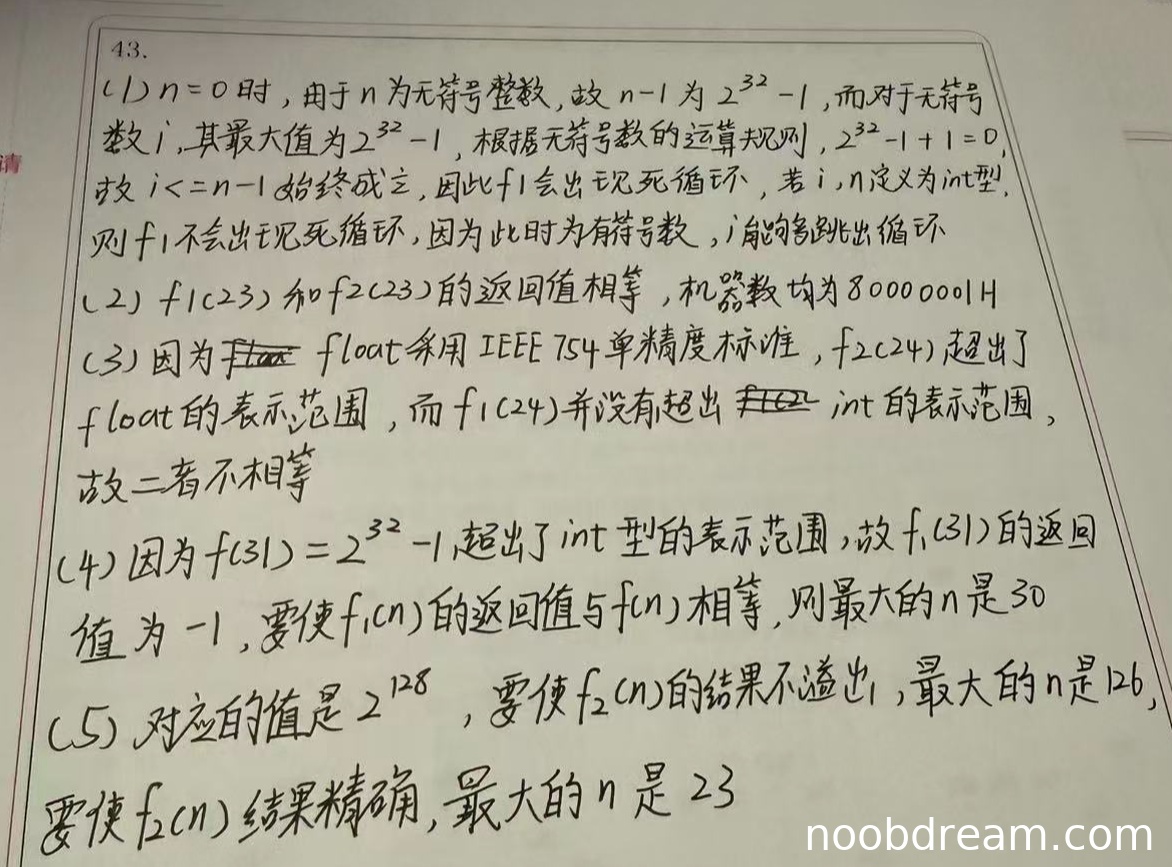学生回答“f2(24)超出了float的表示范围”不准确。f2(24) 的结果并未超出 float 的表示范围(即未发生溢出),而是因为 float 的尾数有效位只有24位,而 f(24) 需要25位精确表示,因此进行了舍入,导致结果增大1。学生解释存在逻辑错误。因此,本题扣1分,得0分。