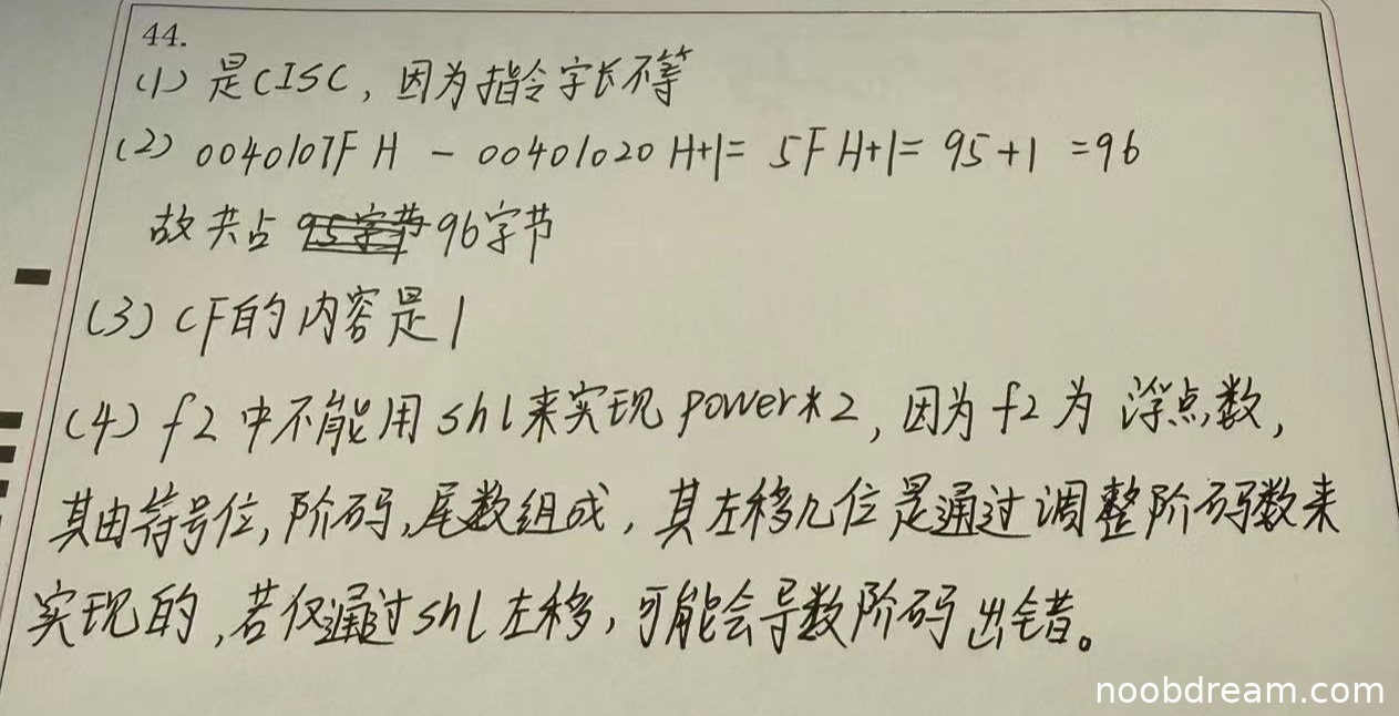 标准答案:f2 中不能用 shl 指令实现 power*2。shl 指令将整数所有有效数位整体左移,f2 中变量 power 是 float 型,其机器数含阶码部分,无最高有效数位,整体左移不能实现 “乘 2” 功能。