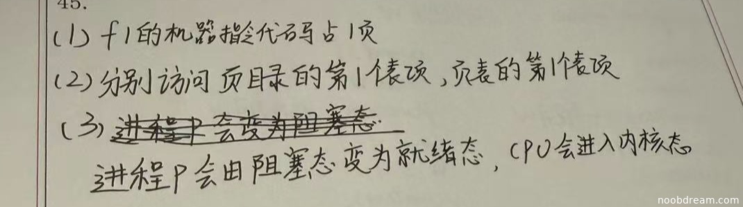 综合考虑,学生的回答抓住了核心状态变化(阻塞、就绪)和CPU状态变化(内核态),但过程描述不够精确和完整。根据评分要求,思路正确不扣分,但逻辑不完整应适当扣分。扣1分。得3分。