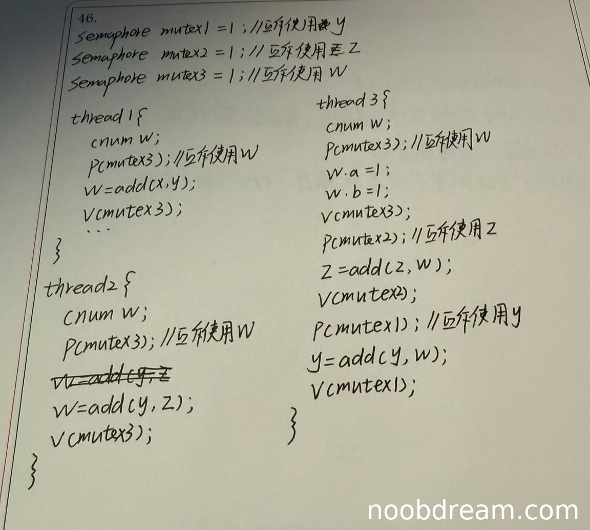 thread1 中只对 w(局部变量)加锁,未对全局变量 y 加锁,无法保证与 thread3 对 y 的互斥访问,逻辑错误,扣2分;thread2 中同样只对 w 加锁,未对 y 和 z 加锁,无法保证与 thread3 对 y、z 的互斥,逻辑错误,扣2分;thread3 中对 w 加锁多余,且对 y 只用一个 mutex1 加锁,无法实现与 thread1、thread2 之间的精细互斥(即允许 thread1 和 thread2 并发),但至少对 y 和 z 的写操作加了锁,有一定保护作用,扣1分。该部分得0分。