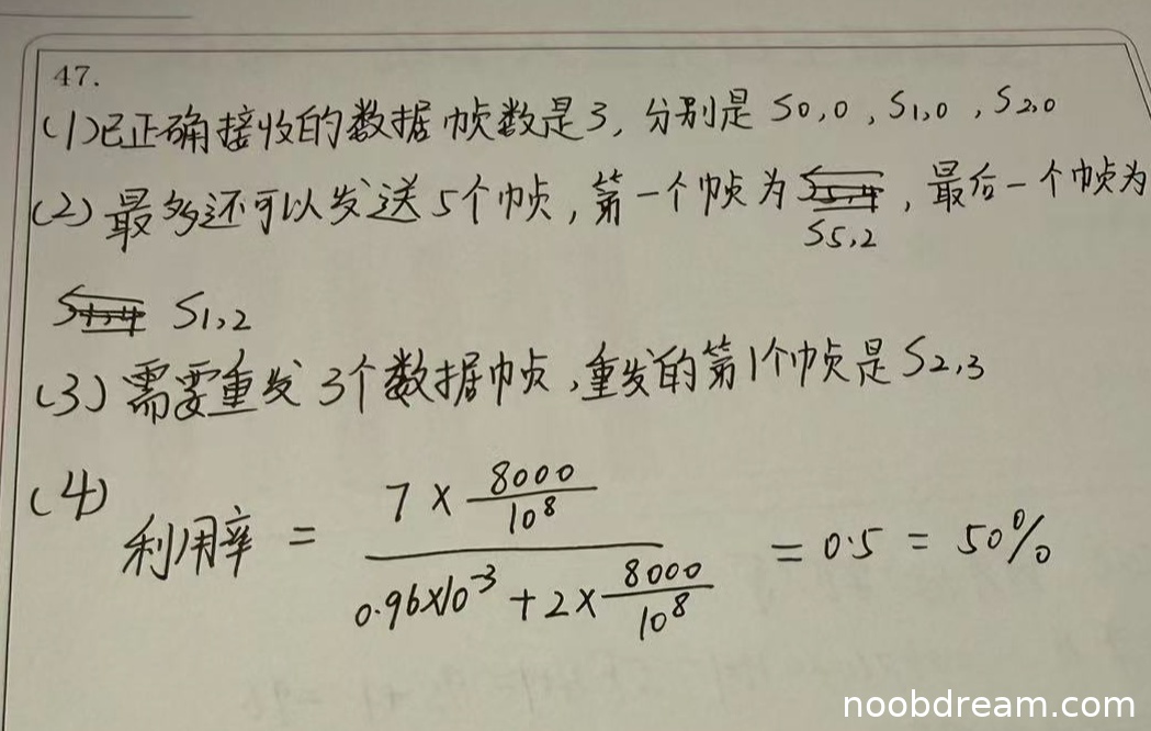 标准答案:需要重发3个数据帧,重发的第一个帧是S2,3。