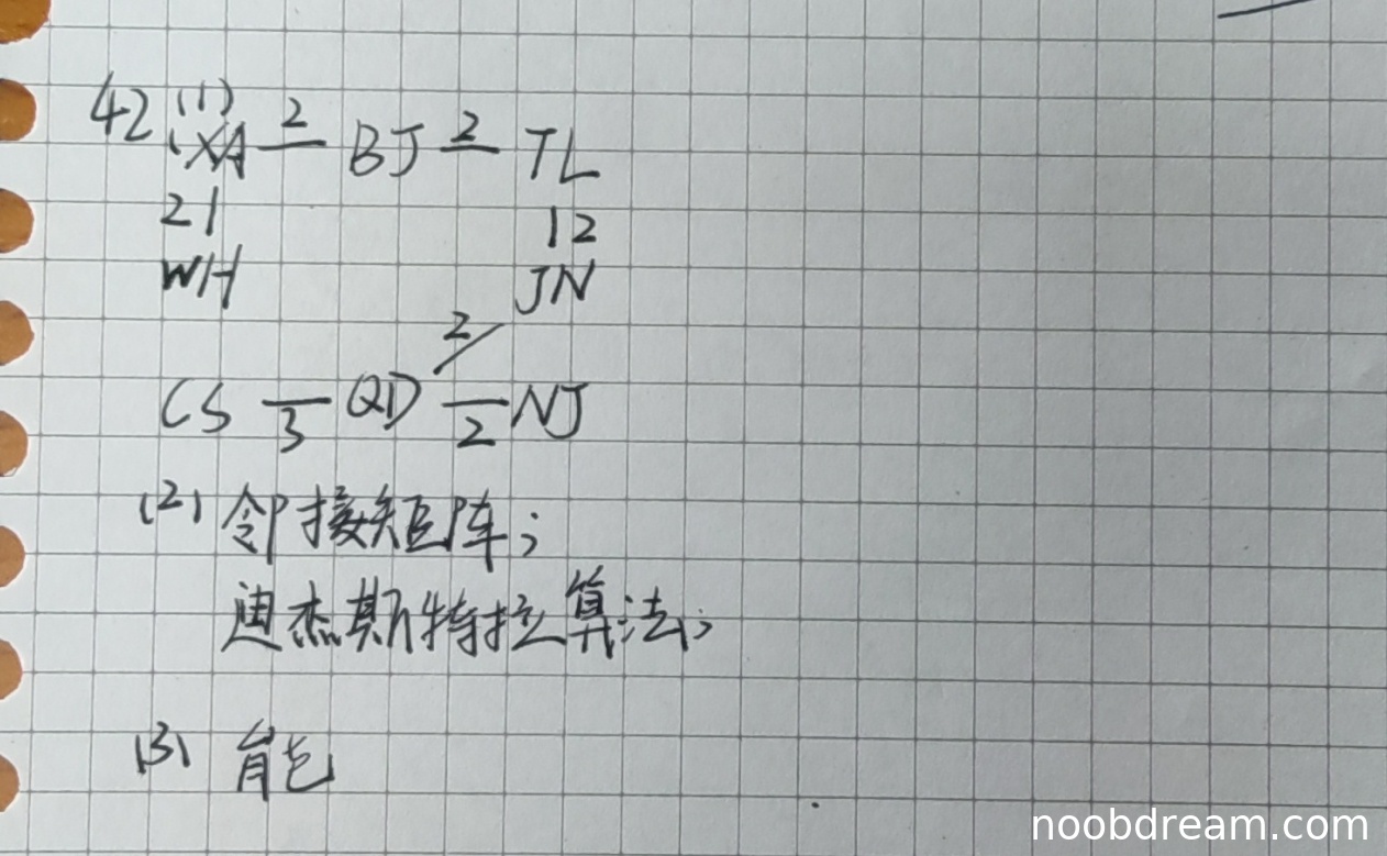 学生两次识别结果均指出存储结构为“邻接矩阵”,这是正确的(标准答案也接受邻接表,邻接矩阵是常见选择)。对于算法,学生两次均回答“迪杰斯特拉算法”,这是错误的。迪杰斯特拉算法用于单源最短路径,而问题(1)是求最小生成树,应使用Prim或Kruskal算法。因此,存储结构部分正确(2分),算法部分错误(0分),本小题得2分。