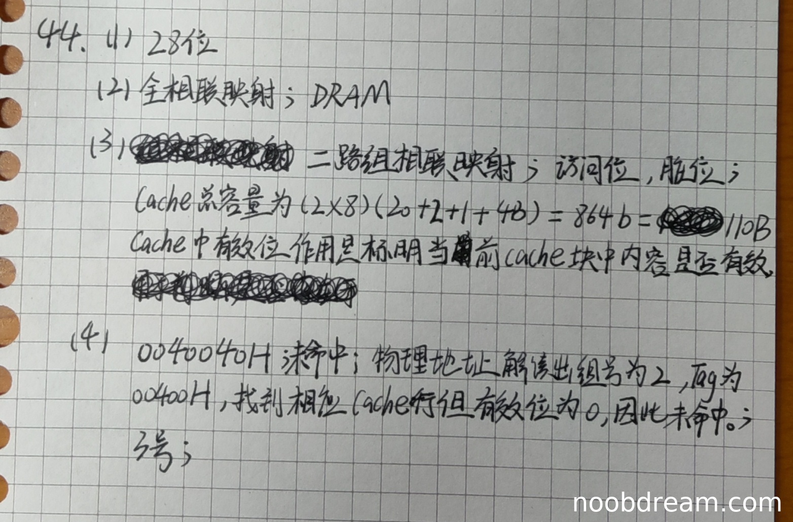 第三问计算Cache总容量错误。学生计算过程为 (2×8)×(20+2+1+48)=864b=110B。其中,20位Tag,2位LRU(2路组相联,1位即可),1位有效位,48字节数据(块内地址5位,块大小为2^5=32字节,而非48字节)。因此正确计算应为:每行容量 = 20(Tag) + 1(有效位) + 1(脏位) + 1(LRU位) + 32×8(数据位) = 20+1+1+1+256 = 279位。总行数 = 2路 × 8组 = 16行。总容量 = 279位 × 16 = 4464位 = 558字节。学生答案“110B”错误,扣1分。