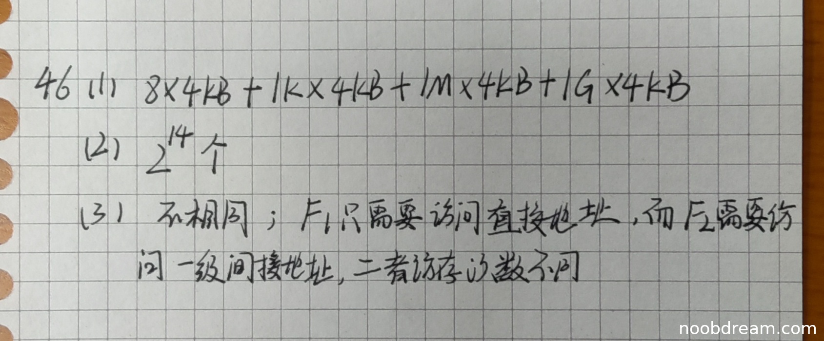 对比两者,学生的表达式“1K”、“1M”、“1G”分别对应标准答案中的\(1024\)、\(1024^2\)、\(1024^3\),含义完全一致。表达式结构正确,包含了直接、一级、二级、三级间接地址项所能寻址的全部数据块(簇),并乘以簇大小。因此答案正确。