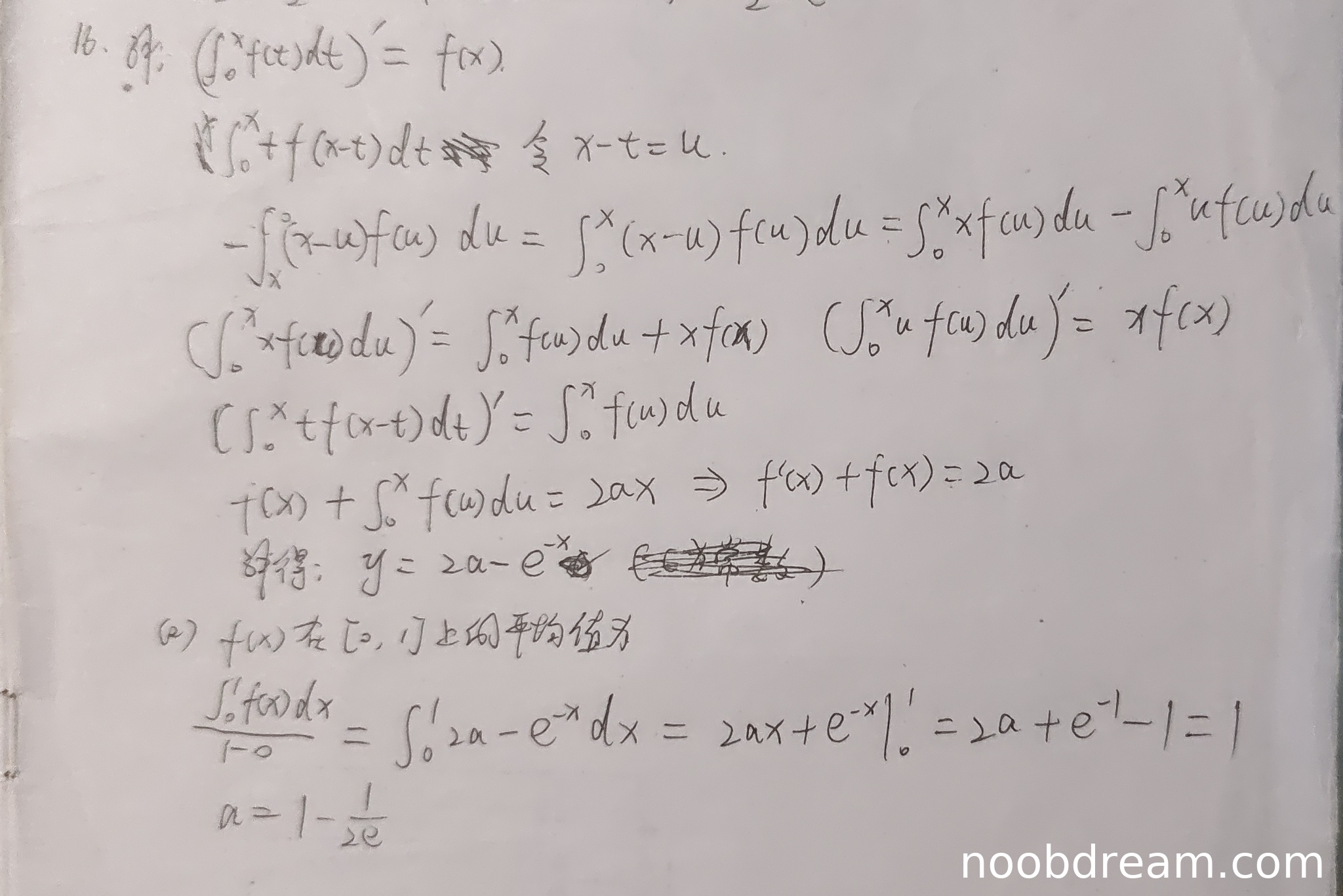 学生作答在第一次识别中,对积分 \(\int_{0}^{x} t f(x-t) dt\) 的变量代换处理有误(写成了 \(\int_{0}^{x} f(x-t) dt\),漏掉了因子 \(t\)),导致后续求导结果出现偏差。但第二次识别给出了正确的变量代换过程:\(\int_{0}^{x} t f(x-t) dt = \int_{0}^{x} (x-u) f(u) du = x\int_{0}^{x} f(u) du - \int_{0}^{x} u f(u) du\)。代入原方程后得到: \[ \int_{0}^{x} f(t) dt + x\int_{0}^{x} f(u) du - \int_{0}^{x} u f(u) du = a x^2 \] 两边对 \(x\) 求导,利用乘积法则和变上限积分求导,得到: \[ f(x) + \int_{0}^{x} f(u) du + x f(x) - x f(x) = 2a x \] 即 \[ f(x) + \int_{0}^{x} f(u) du = 2a x \] 再求导得: \[ f'(x) + f(x) = 2a \] 这是一阶线性微分方程,解得通解为 \(f(x) = 2a + C e^{-x}\)。利用初始条件(令原方程中 \(x=0\) 可得 \(f(0)=0\))得 \(C = -2a\),所以 \(f(x) = 2a - 2a e^{-x}\)。