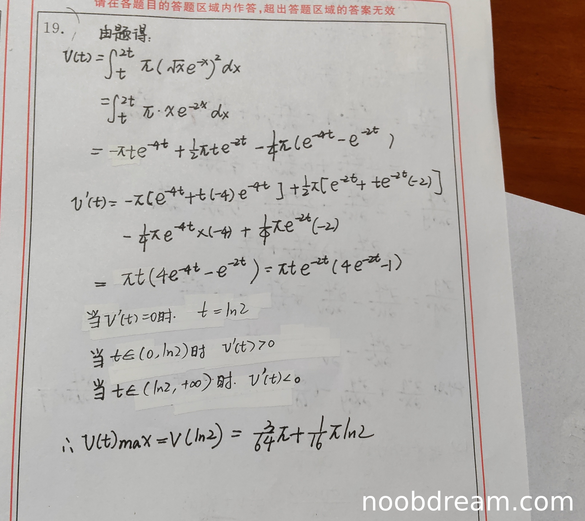 - 正确求出 \(V'(t) = \pi t e^{-2t}(4e^{-2t}-1)\)。