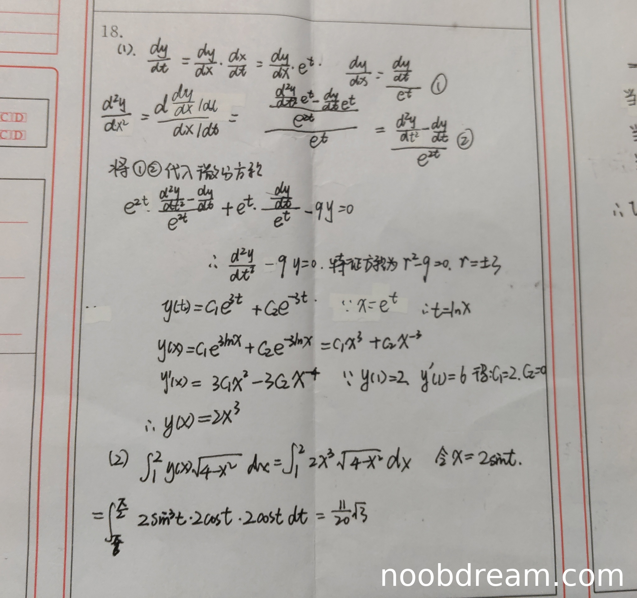 学生作答中,利用变换 \(x = e^t\) 正确推导了复合函数的一阶和二阶导数,并代入原方程化简得到常系数线性齐次微分方程 \(\frac{d^2y}{dt^2} - 9y = 0\),求解得到通解 \(y = C_1 x^3 + C_2 x^{-3}\)。代入初始条件 \(y(1)=2, y'(1)=6\) 后,正确解得 \(C_1=2, C_2=0\),从而得到 \(y(x)=2x^3\)。整个推导过程逻辑清晰,计算正确,与标准答案一致。因此,第(1)问得满分6分。
