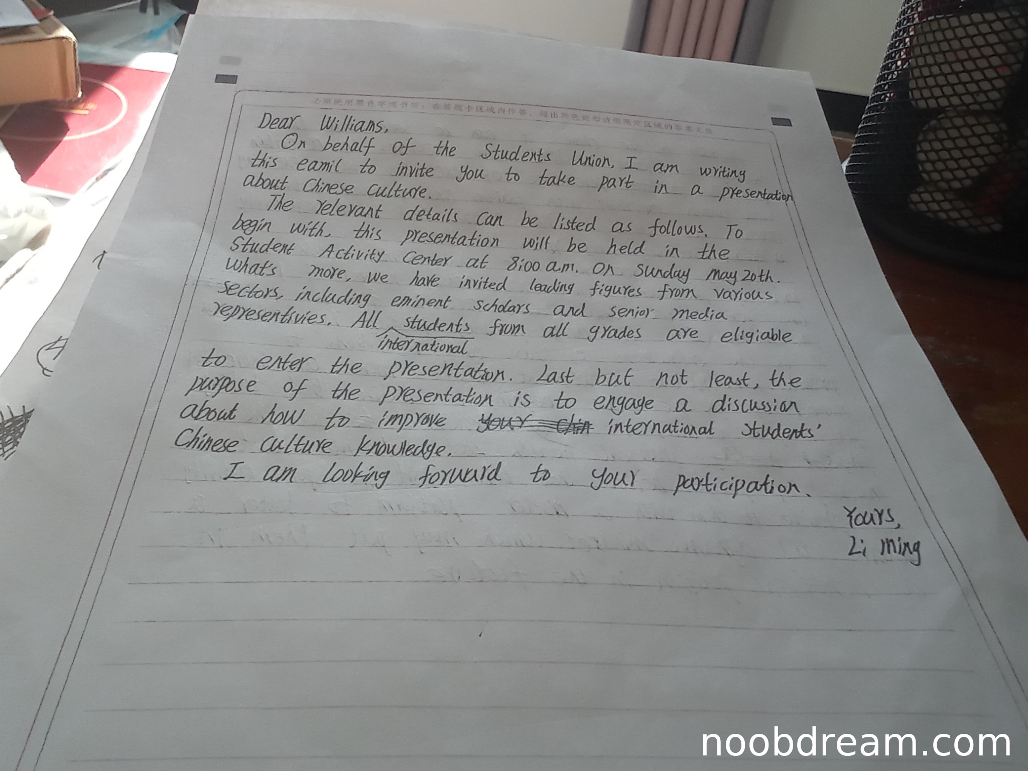 学生作答内容与题目要求严重不符。题目要求是回复Williams教授的邀请,接受邀请并介绍自己演讲的要点。而学生的两次识别结果都是在以学生会的身份向Williams教授发出邀请,内容完全跑题。因此,内容要点(接受邀请、介绍要点)全部缺失,属于“内容与题目无关或严重跑题”。