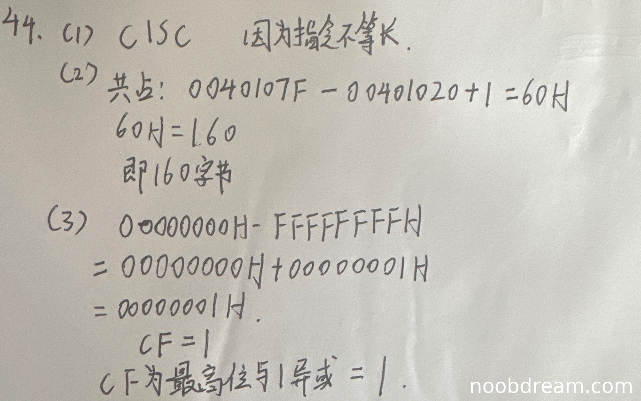 学生回答“CF = 1”,结果正确。计算过程“00000000H - FFFFFFFFH = 00000000H + 00000001H = 00000001H. CF为最高位与1异或 = 1”与标准答案思路一致(减法变补码加法,CF = C⊕1),虽然表述略简,但逻辑正确。得3分。